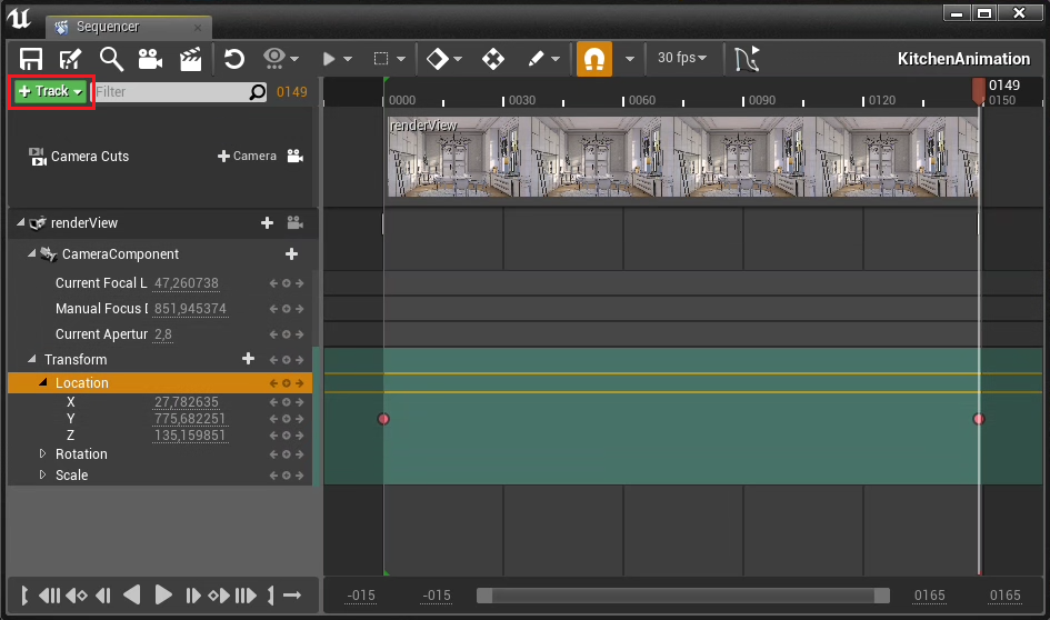 Paso 1: Configuración, en primer, creas una secuencia de niveles. Esto se podría hacer desde Cinematics > Add Level Sequence. Selecciona la carpeta donde se guardará la secuencia de animación. Ahora, tienes que añadir un actor de cámara desde el nivel a la secuencia. Para hacer eso vamos al menú Secuenciador > Pista > Actor a secuenciador y seleccionas el actor de la cámara.