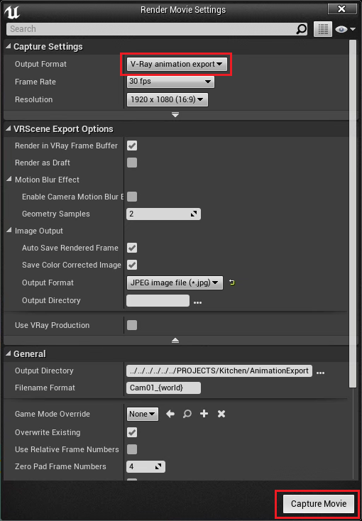 Paso 2: Exportamos con Vray. Una vez listo con la configuración anterior, vamos a Render Movie Settings. En el panel Configuración de captura > Formato de salida, seleccione la opción de exportación de animación de Vray.