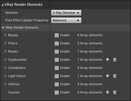 Elementos de renderización en Unreal Engine. Cuando accedemos al panel de elementos mediante el menú de configuración de Vray, no encontramos con una ventana donde podemos distinguir claramente la descomposición de los mismos, como el color difuso, los reflejos, las sombras, los mates, etc. Esto proporciona un control preciso sobre la imagen final cuando se utilizan aplicaciones de composición o edición de imágenes al volver a ensamblar la imagen final desde sus elementos componentes.