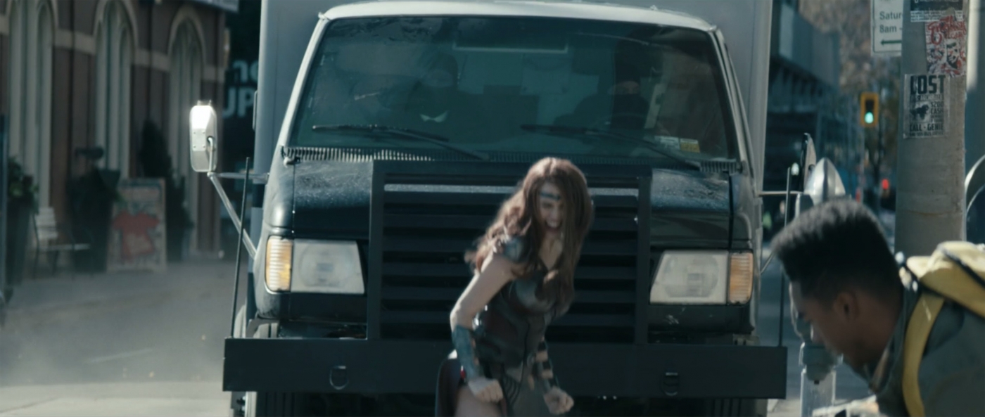 Para la escena de apertura de la serie, FrameStore creó un doble digital de Queen Maeve, un miembro del famoso grupo de superhéroes Seven de la serie, mientras salta sobre un accidente automovilístico de varios vehículos policiales reemplazados digitalmente y detiene un camión con su cuerpo. A medida que la reina Maeve atraviesa el vehículo blindado, el equipo de efectos visuales necesitaba añadir algunos escombros increíblemente detallados que vuelan a través del aire a cámara súper lenta.