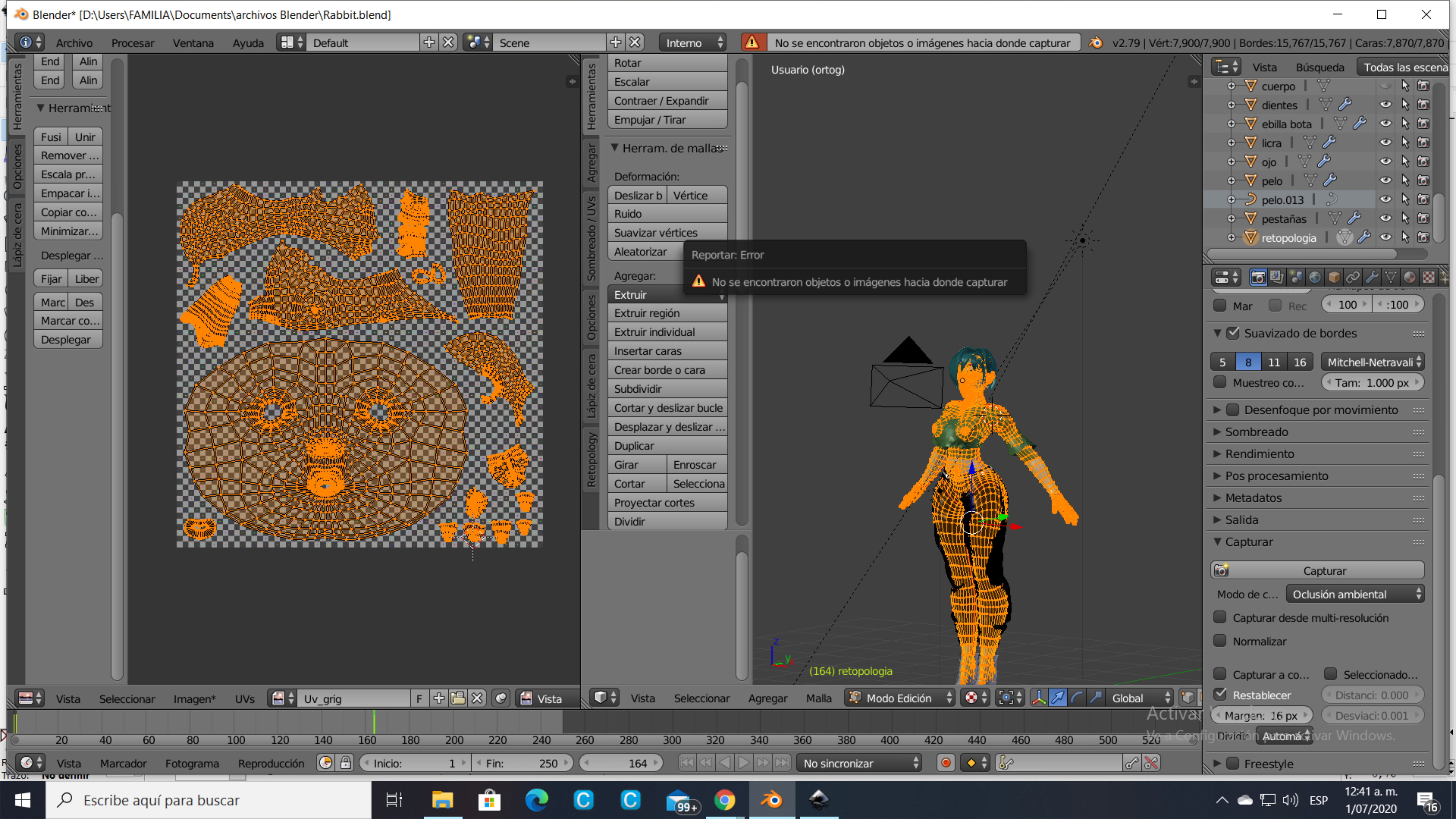 Me aparece un error "no se encontraron objetos ni imágenes donde capturar" la verdad he hecho todo lo que sabia para resolverlo y no puedo, me gustaría pedir por favor una asesoría, y junto con esto descubrí que a la hora de hacer renderizado para ver como va mi personaje, lo que es la retopología y las pestañas no aparecen.