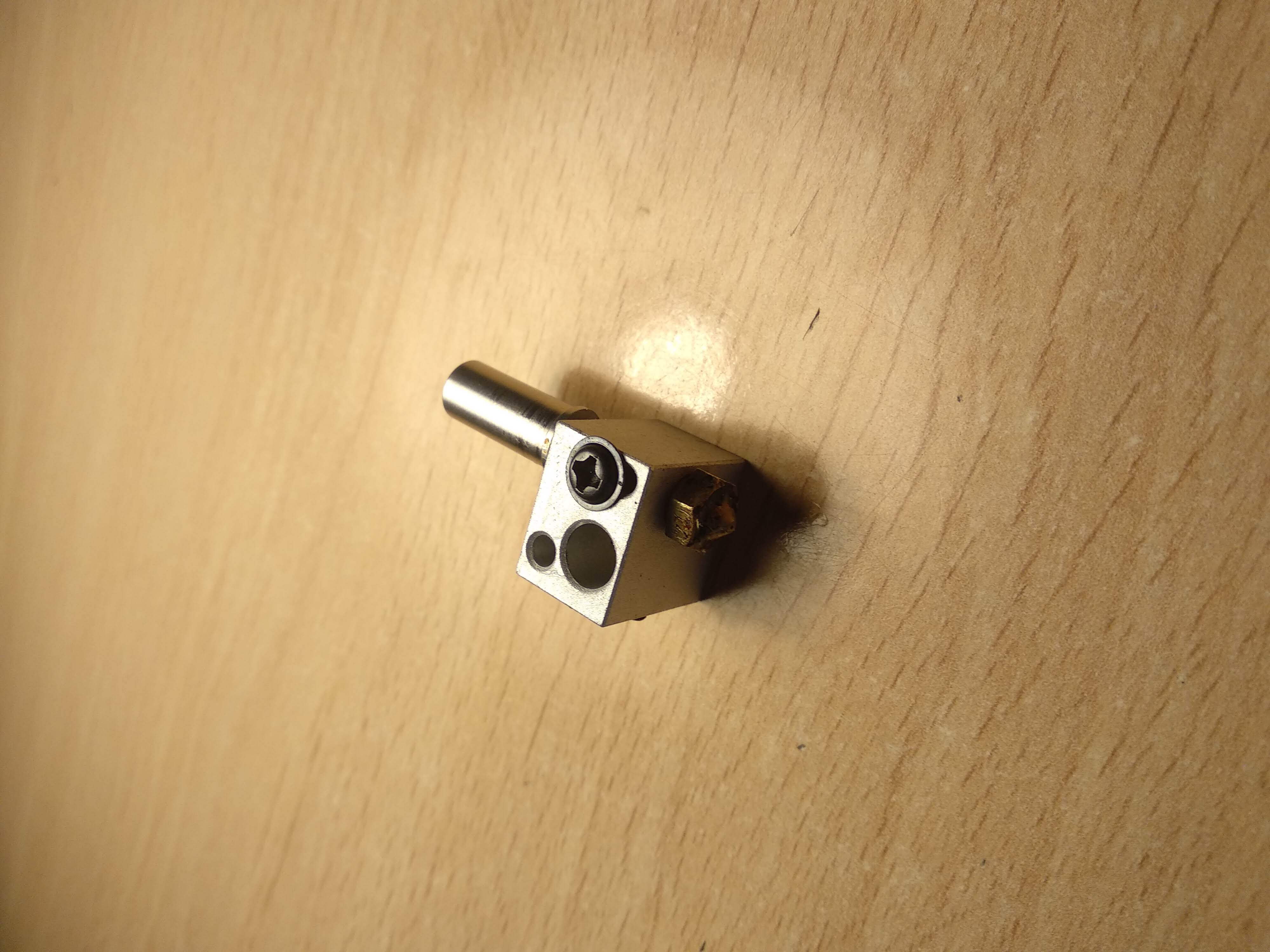 Intenté desatascarlo pero el problema seguía, y pensando que el problema era del tubo de teflón le corte la parte más afectada por la temperatura y nada. También cambie el bloque calentador, la boquilla y la garganta (adjunto fotografía de la pieza vieja) y nada tampoco.