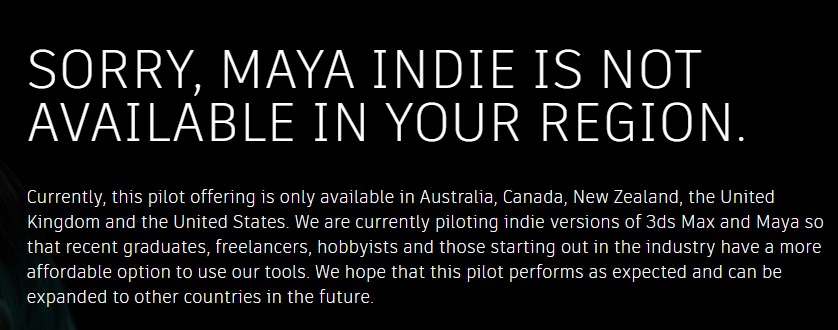 A la hora de publicar esta noticia si accedemos a la dirección https://area.autodesk.com/maya-indie/ desde España nos aparece este mensaje:
