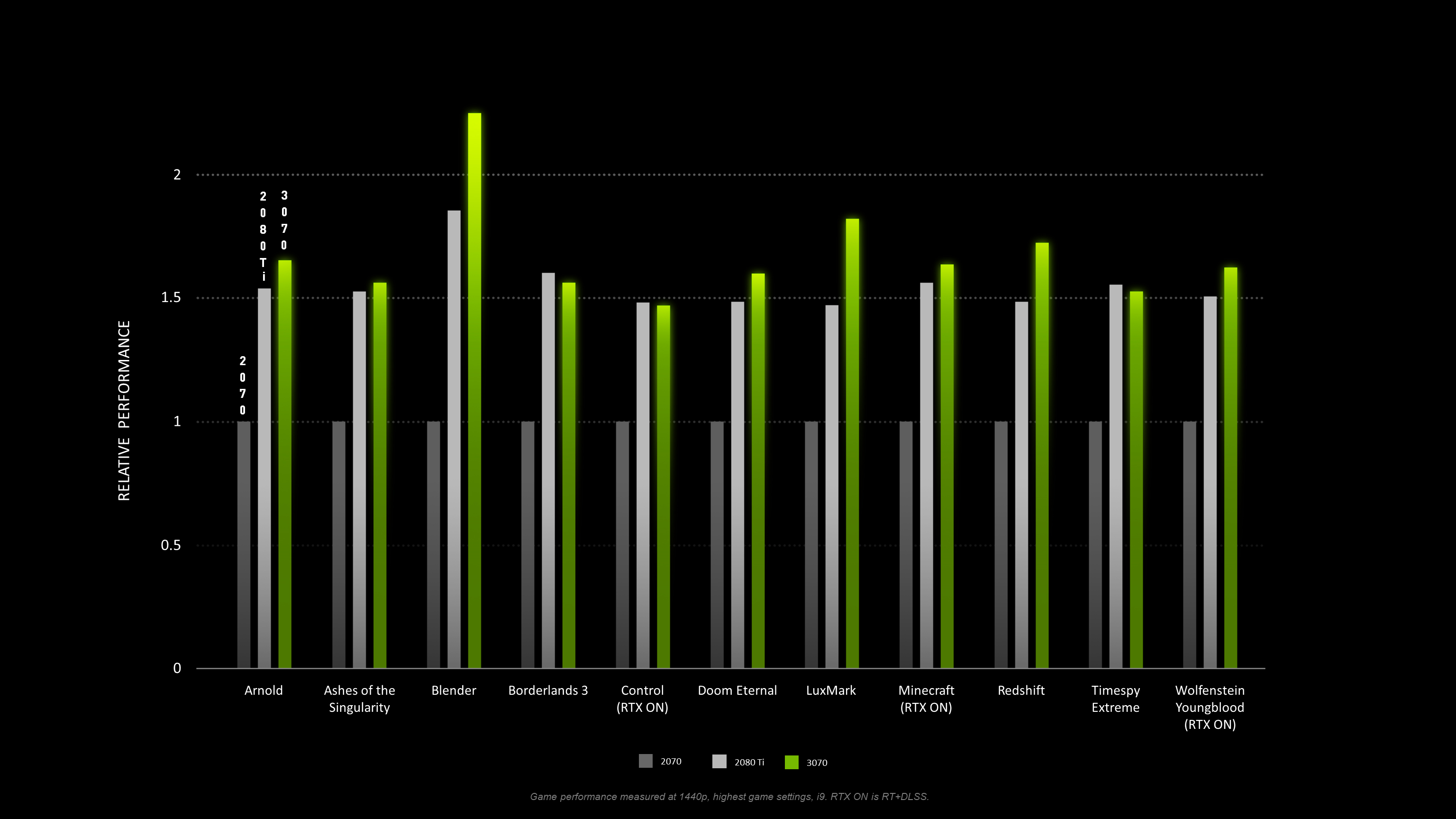 La firma pone a la venta las tarjetas Ampere como un avance significativo con respecto a sus predecesores, describiendo incluso a la RTX 3070 como más rápida que el modelo insignia anterior, el RTX 2080 Ti.