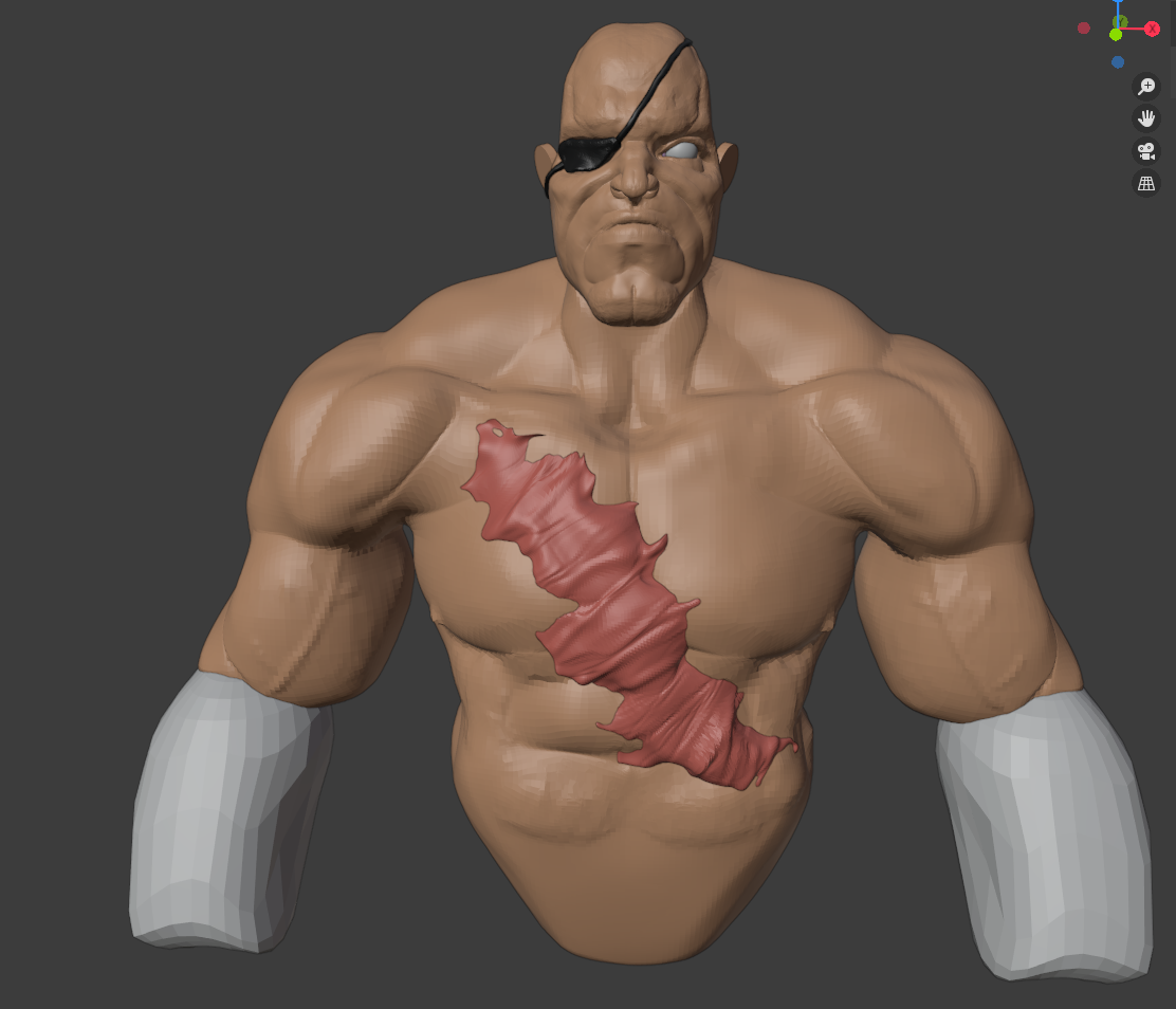 Para el tema Scratch sí use el la simetría para el cuerpo, pero no para el parche ni la cicatriz. Por lo general intento romper la simetría al final del modelado, pero esta vez ya le había dedicado mucho tiempo para ser un ejercicio de un día, y el parche y la cicatriz rompían la simetría lo suficiente como para darlo por bueno.