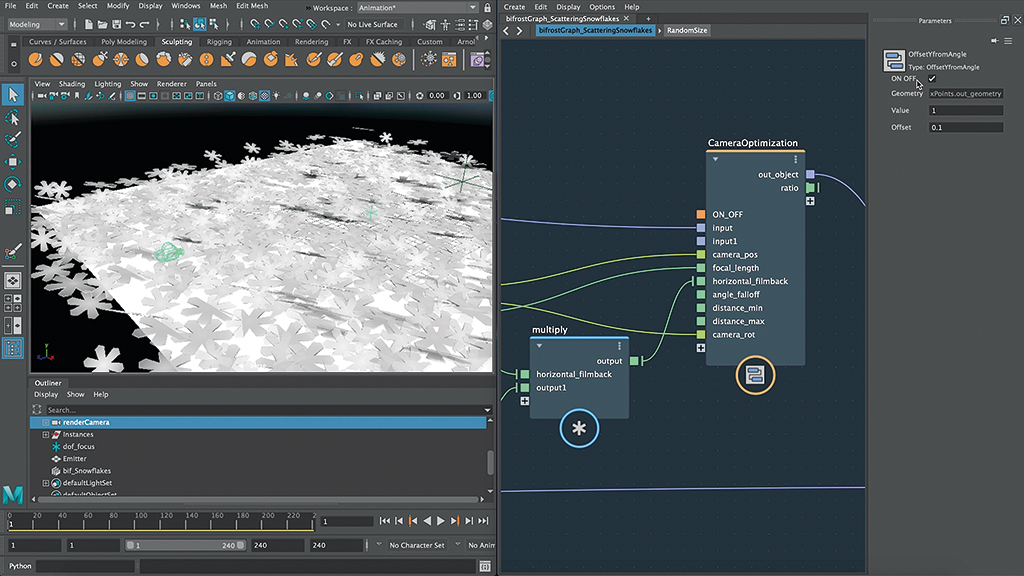 Bifrost para Maya introduce un nuevo solucionador FLIP para simulaciones de líquidos directamente en el gráfico nodal, aunque está orientado principalmente a fluidos a gran escala. El sistema incluye 20 nuevos tipos de nodos.