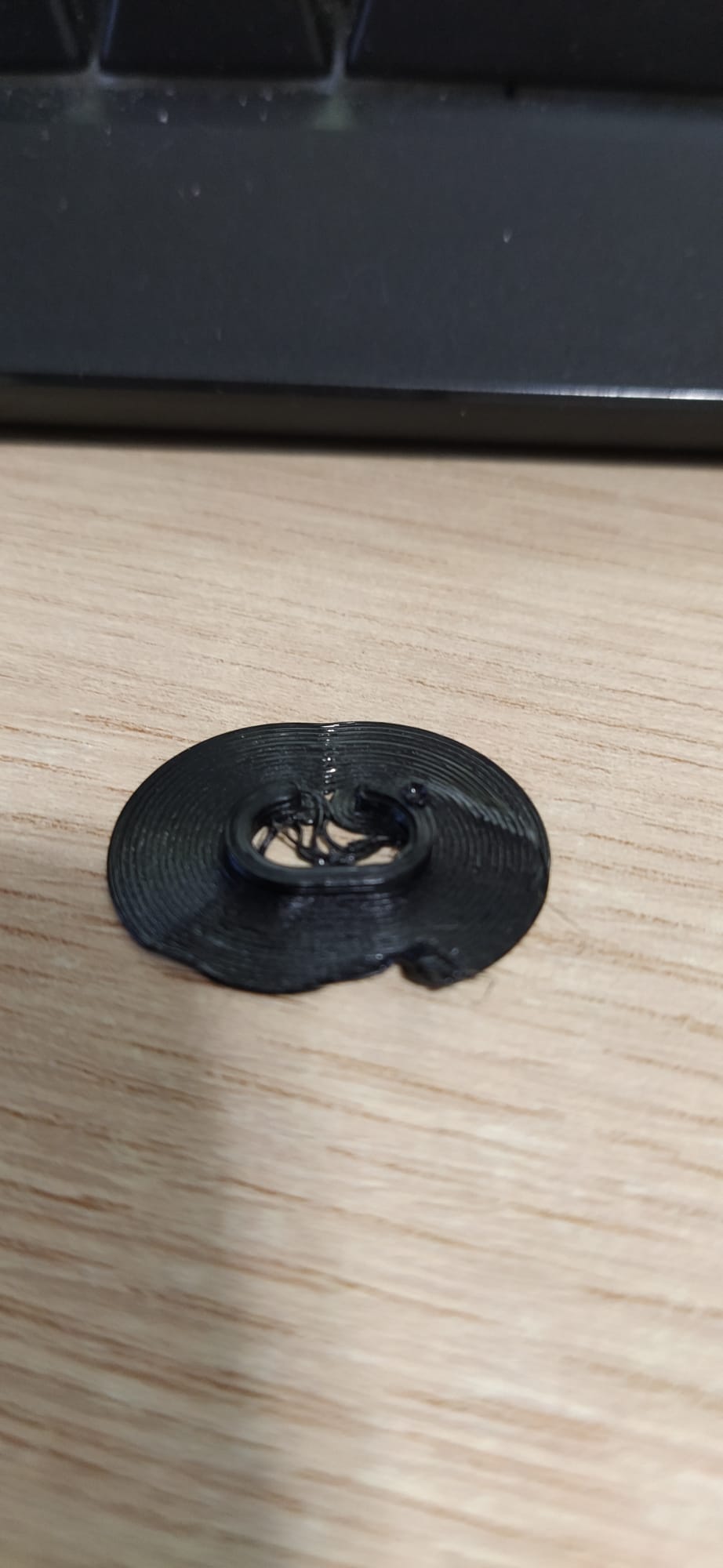 Disculpad la mala calidad de esta imagen, la saqué de madrugada y de un humor bastante malo ya. Pensé que podría ser que mi archivo estuviese mal diseñado, lo que seria totalmente normal al ser totalmente nuevo en este mundillo, así que probé de nuevo la primera pieza que salió tan bien, y pasaba lo mismo, la boquilla se llevaba el filamento y se hacia bola.