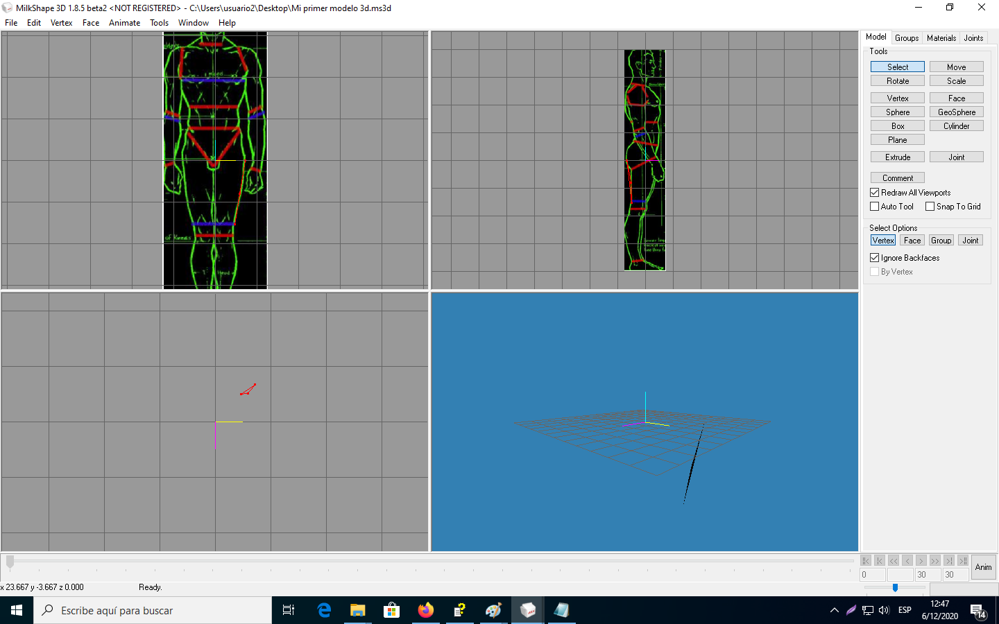 ¿Pueden decirme exactamente como se llama esta técnica de modelado 3d? Yo busqué y dice con Blueprints o referencias. También encontré otro termino más especifico que dice con vértices. Lo que estoy haciendo es colocar tres vértices rodeando el contorno de la pierna de un ser humano, y según lo que explica en internet, debo ir haciendo que los puntos encajen tanto en la vista frontal, siguiendo el contorno, como en la vista lateral. Aun no trabajo con tops o vistas superiores porque estoy siguiendo el tutorial. Aquí les dejo una captura de pantalla. Para que por favor me asesoren. Se que Milkshape3d no es la mejor opción ya que es demasiado simple, pero es mejor usarlo que no usar nada. Esto temporalmente mientras soluciono el problema con mi tarjeta grafica y corro Blender.