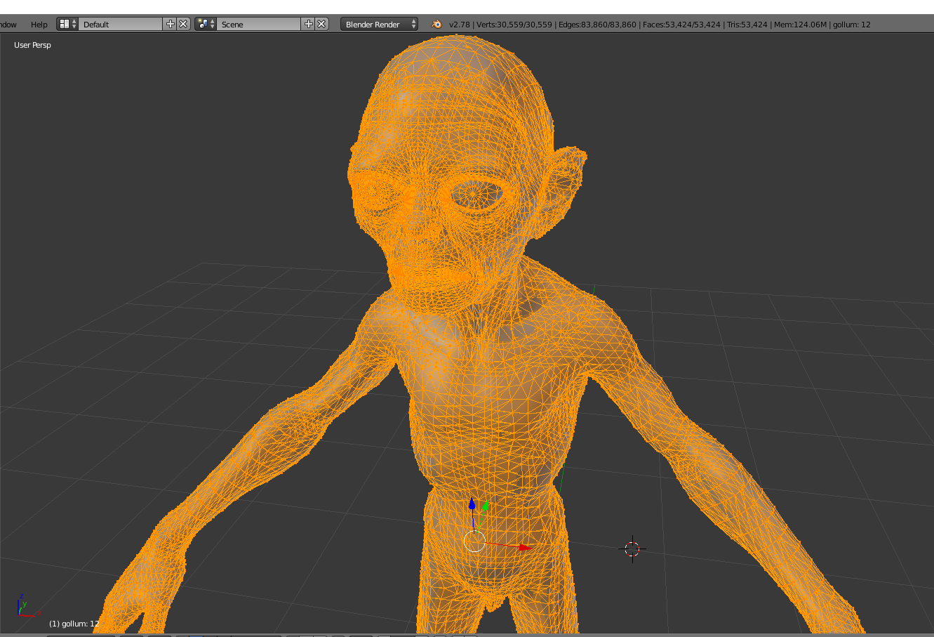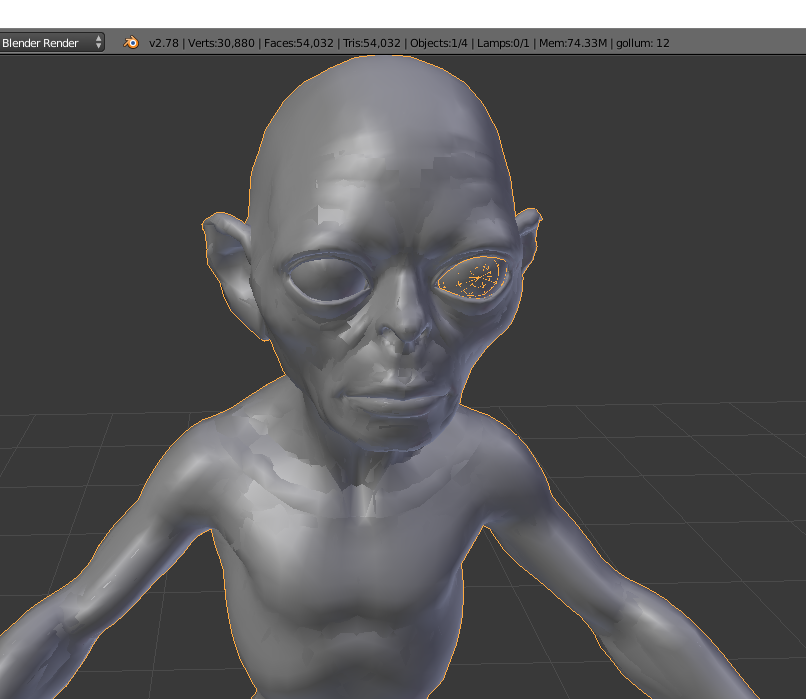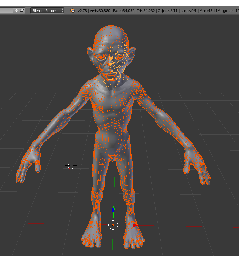 Hola a todos. Disculpad mi ignorancia, pero llevo varias semanas tratando de buscar una solución a este problema y no hay manera. Llevo poco tiempo en Blender y hasta ahora no me había ocurrido nada parecido, así que trataré de explicarme de la mejor manera posible. Estoy trabajando en un proyecto de el señor de los anillos en el que me tuve que bajar un modelo 3D gratuito de Gollum. El modelo es el más decente y parecido al personaje de la película que he encontrado, ya que, ni los de pago están tan bien realizados morfológicamente como éste.