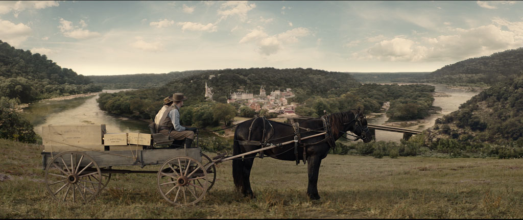 Para la gran revelación de la región de Harpers Ferry, en primer plano aparecen un caballo tirando de un carro en un campo de hierba. Esta toma se realizó mediante pantalla azul. Ingenuity Studios creó todo lo que aparece más allá de los elementos de primer plano para simular Harpers Ferry en 1859 en esta toma panorámica.