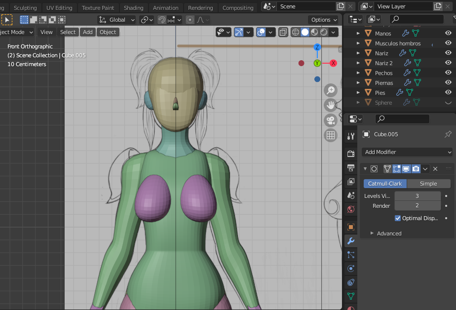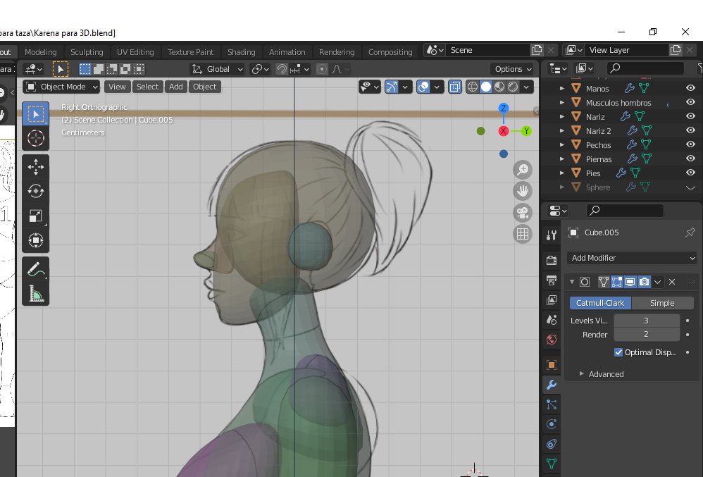 La nariz la tuve que hacer yo con lo poco que había aprendido y no sé tampoco como hacer los orificios nasales de la misma. Y ni siquiera sé si está bien hecha. Sinceramente no sé si hay un orden especifico para hacer cada cosa, a veces me vuelvo loco buscando y no encuentro lo que necesito. Voy a dejar aquí unas capturas de mi modelo a ver si alguien me entiende lo que trato de hacer. Tengo el modelo de perfil y de frente, y quiero hacerle los labios tal cual están en el dibujo, claramente lo hice con referencias de un dibujo mío.