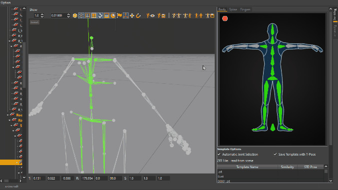 El retargeting utiliza un flujo de trabajo visual simple, con usuarios seleccionando uniones para asignar en plantillas de interfaz de usuario estándar, incluidas plantillas para caracteres humanos, humanoides y cuadrúpedos, y plataformas de manos y pies.