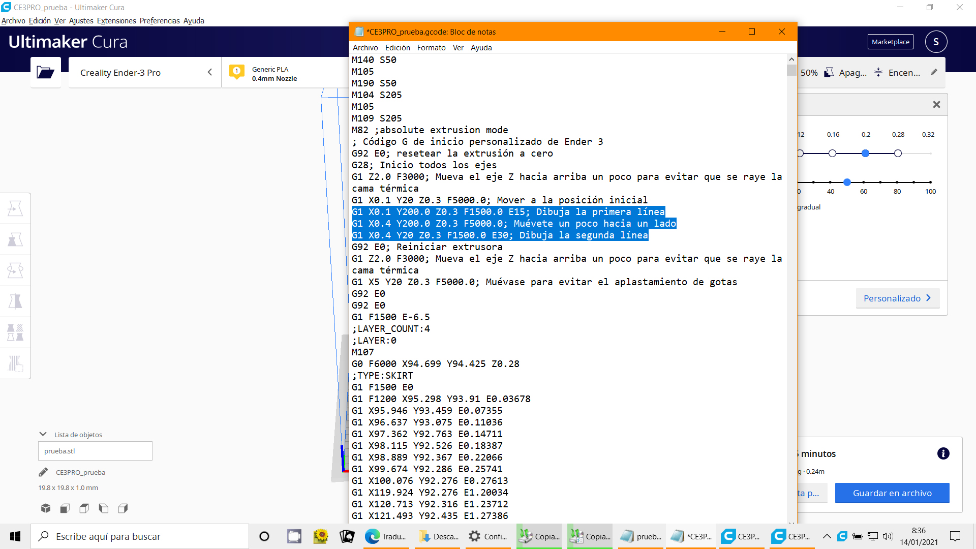 Cuando hago el cubo de calibración me salen las esquinas como salientes, y en las letras también. Mirando un poco por encima eso se corrige con el valor K del firmware. Por lo poco que vi se hace añadiendo al final el siguiente comando M900 Kxx, donde las xx seria el valor de k. En algún video vi que un valor aproximado podría ser 0.1, pero ponga el valor que ponga no me cambia nada.