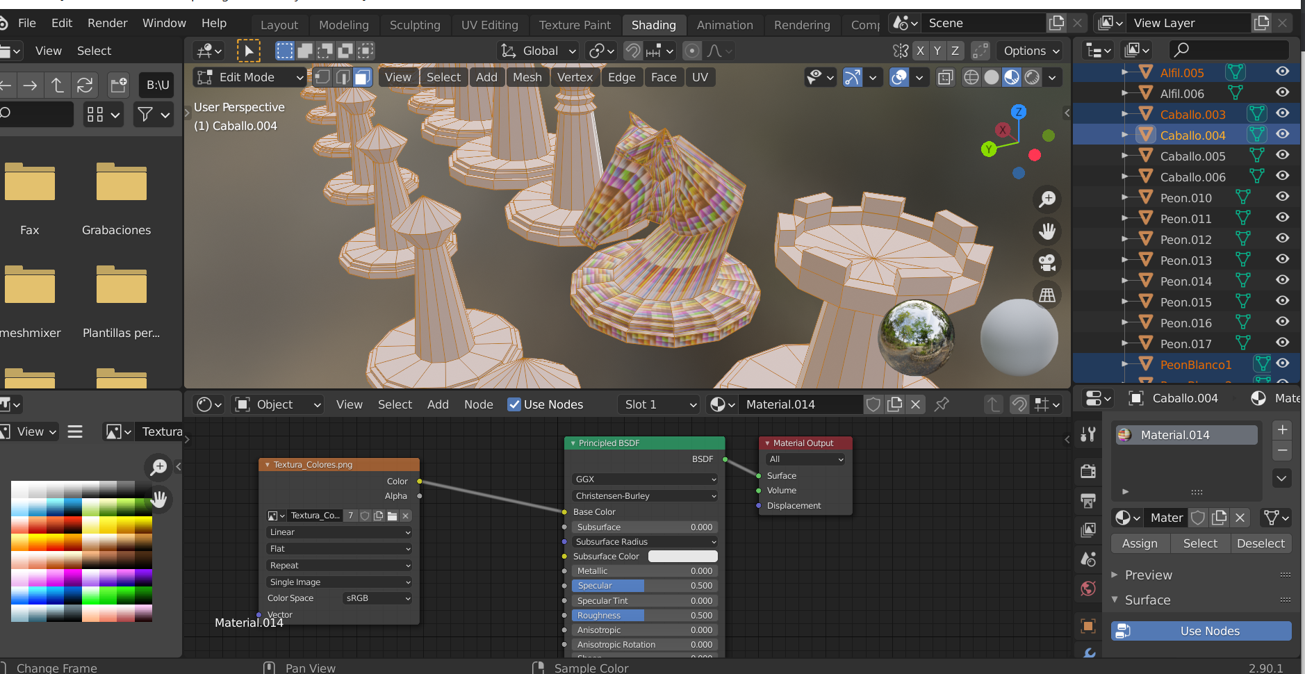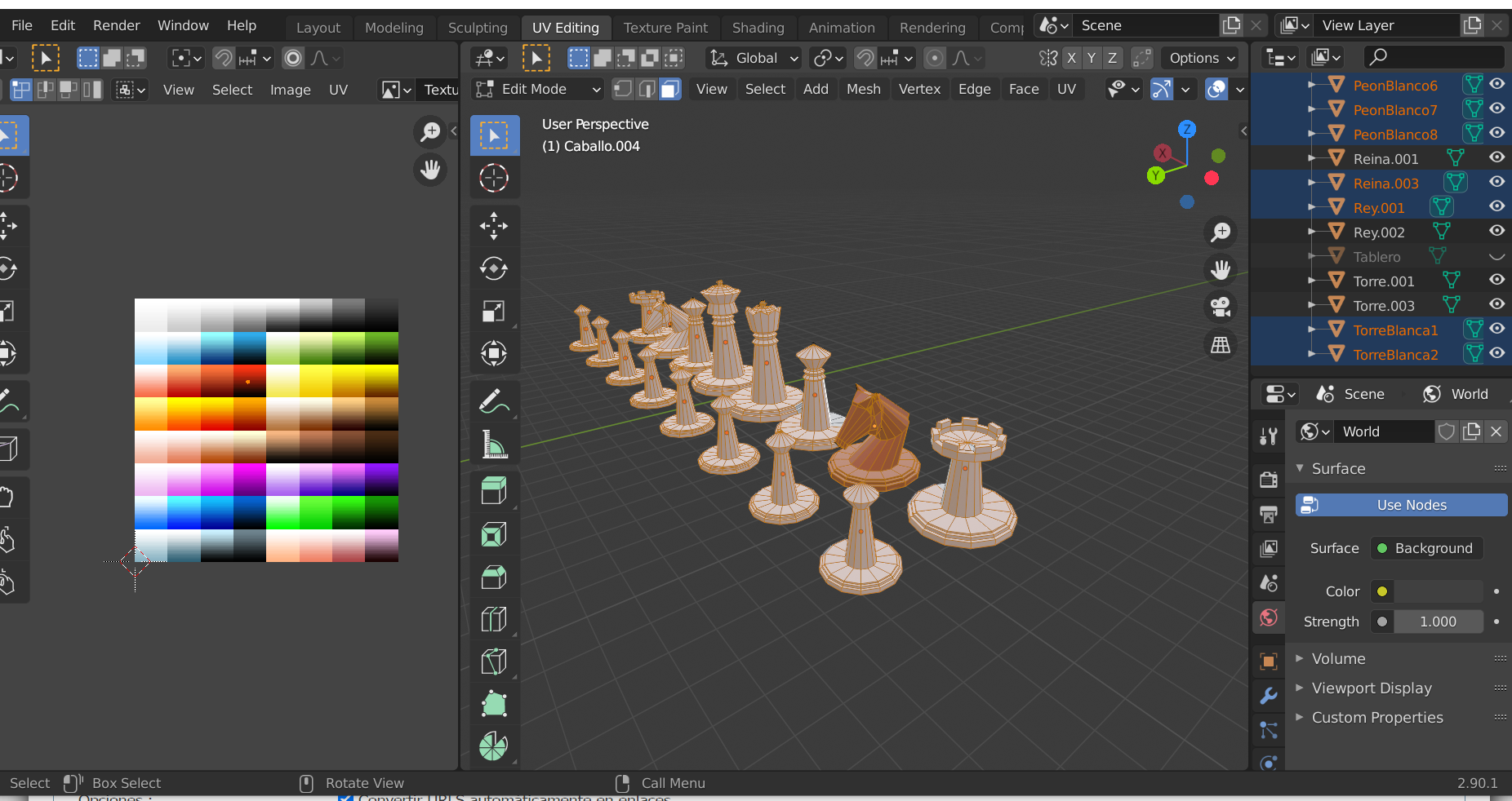 El problema es el del título específicamente. Recién estoy empezando con esto del modelado y sobre todo de las texturas, materiales y colores. En fin, hice unas piezas de ajedrez bien básicas, y ahora sólo quiero asignarles una textura blanca para la mitad de las piezas, y negra para la otra mitad, pero no lo logro.