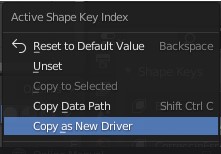 Haciendo click con el botón derecho del ratón sobre la ShapeKey debería aparecer un menú contextual con la opción AddDriver pero no es asó. A mi me aparece el menú que muestro en la imagen adjunta.