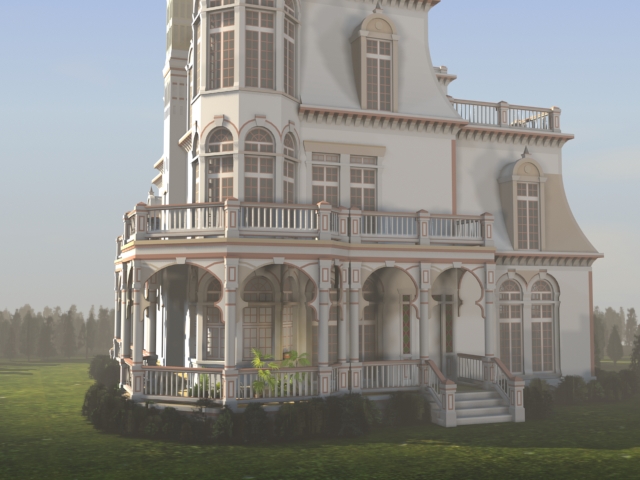 Bueno, lo prometido a mi amigo Strogoff, aunque con demora. Ocurre que no me decidía si hacer un interior o un exterior, y resolví hacer algo intermedio, el exterior de una casa en una cámara y otra cámara en una toma de la galería, teniendo esta segunda las características de iluminación interior, donde los numerosos rebotes son exigentes y muy evidentes, algo que no ocurre tan marcadamente en exteriores donde prima el efecto skylight.