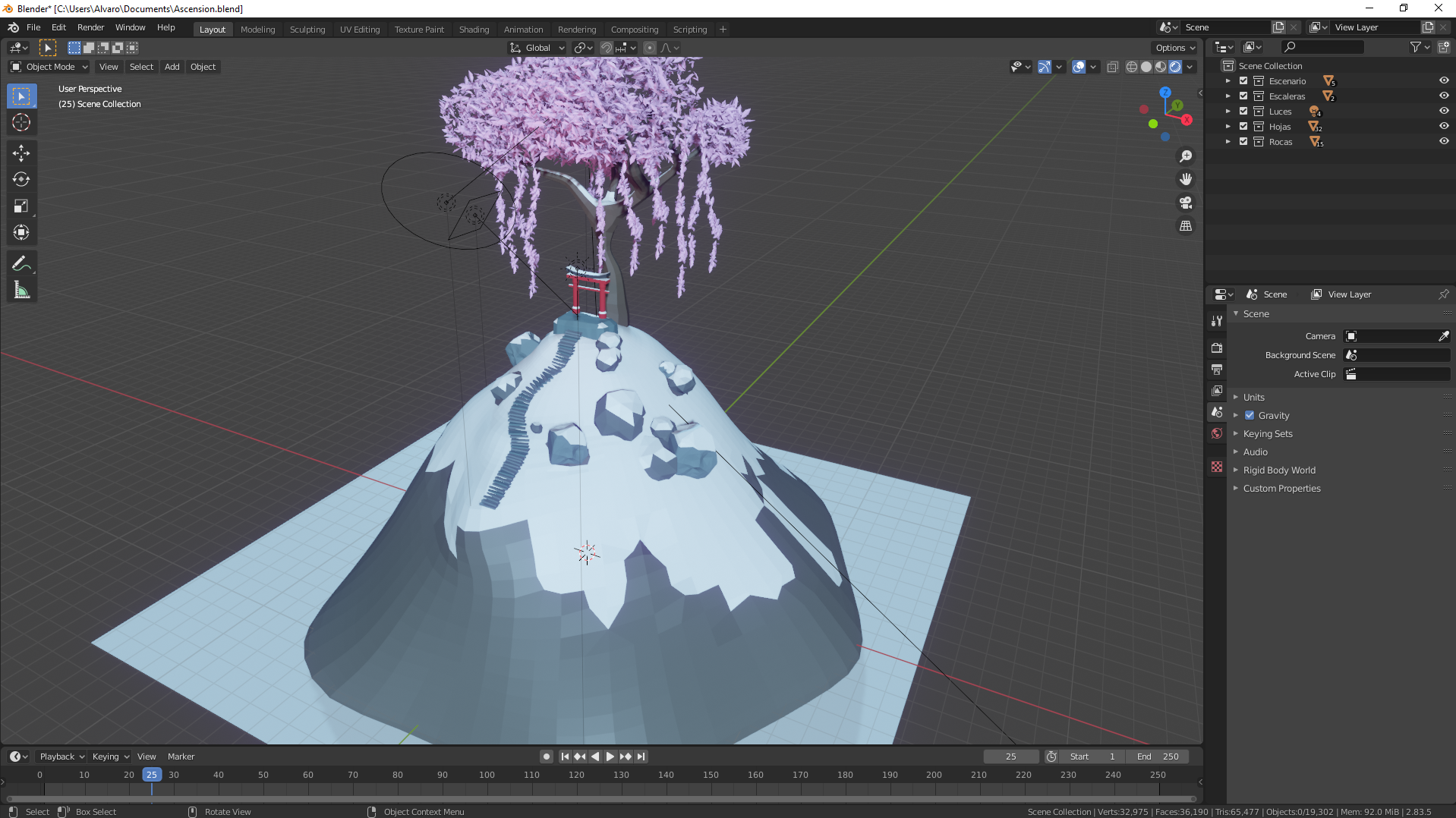 Os dejo una fotografía de lo que estoy haciendo para que me entendáis mejor, lo que quiero hacer es hacer un mar nubes justo donde terminan las escaleras para que solo se vea la cima del montaña y lo de debajo no se vea.