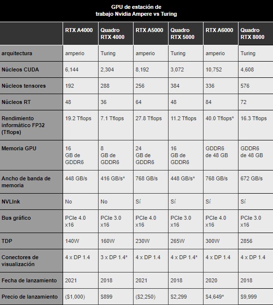 Los precios esperados siguen siendo similares a las tarjetas de la generación anterior, suben ligeramente en el caso del RTX A4000 y la RTX A5000.