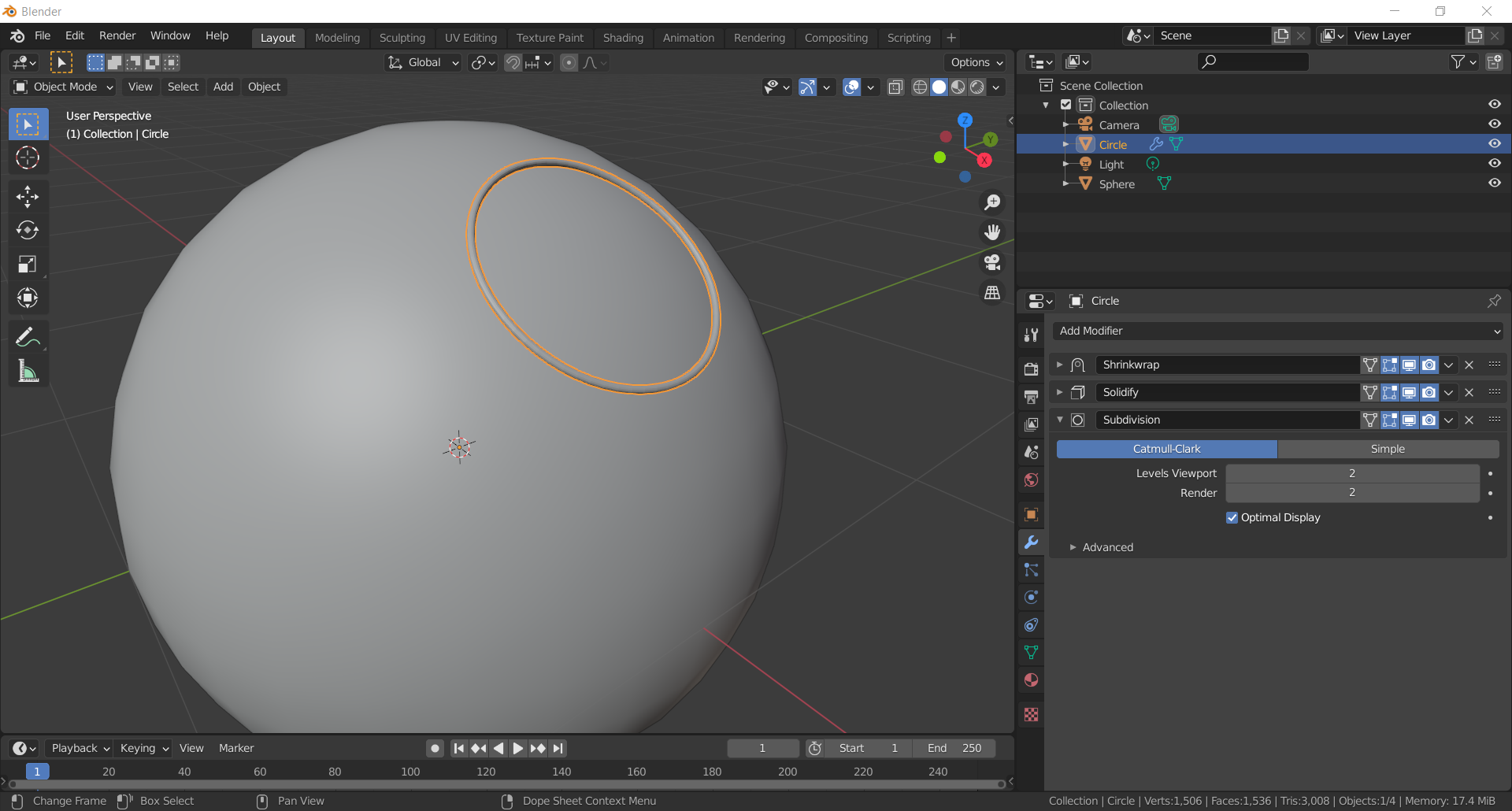 Me gustaría hacer un marco como el de la primera fotografía, he probado a hacerlo con "diferencia" restando la esfera al cuerpo, el cual me funcionó en el primer intento seleccionando después la circunferencia con shift y extruyendo vértices.
