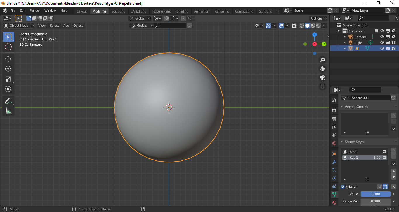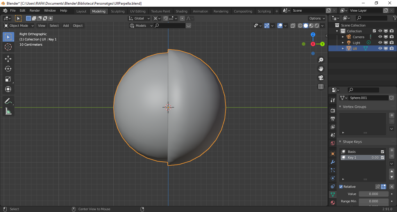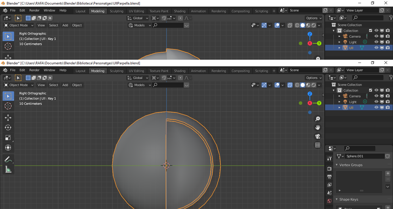 Intento modelar un ojo muy sencillo, compuesto de una esfera para el globo ocular y una semi-esfera para el parpado. Para que el ojo se cierre y se abra he pensado en unir los dos objetos y que el parpado rote alrededor del globo con Shape Keys.