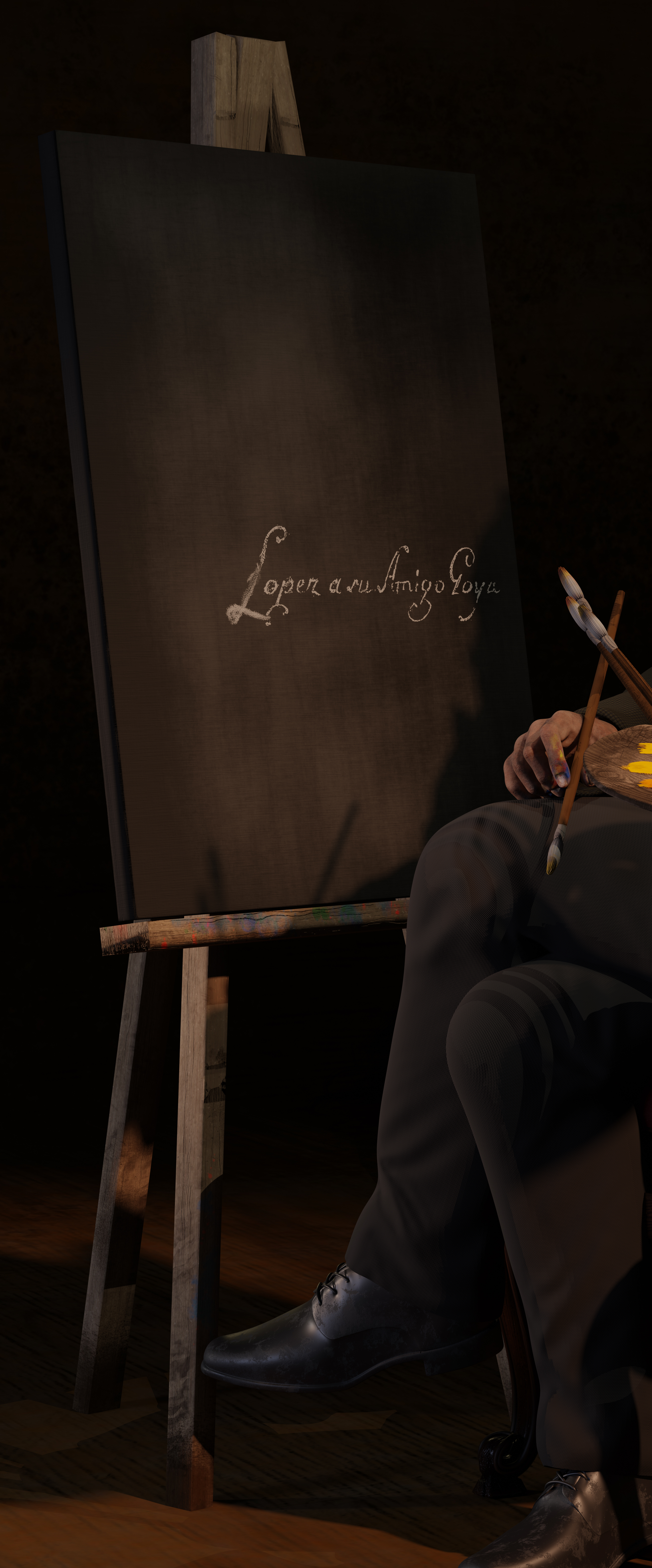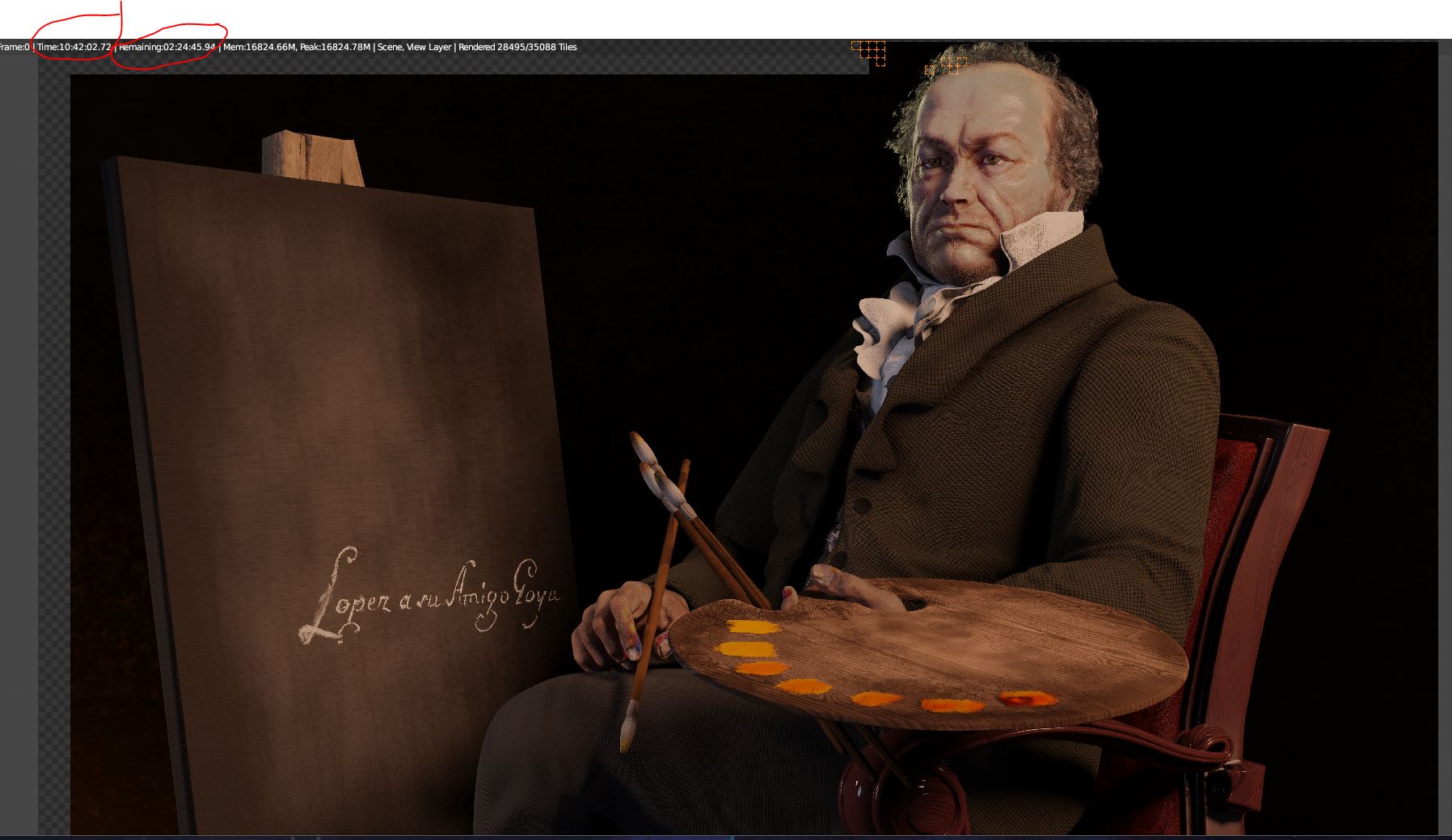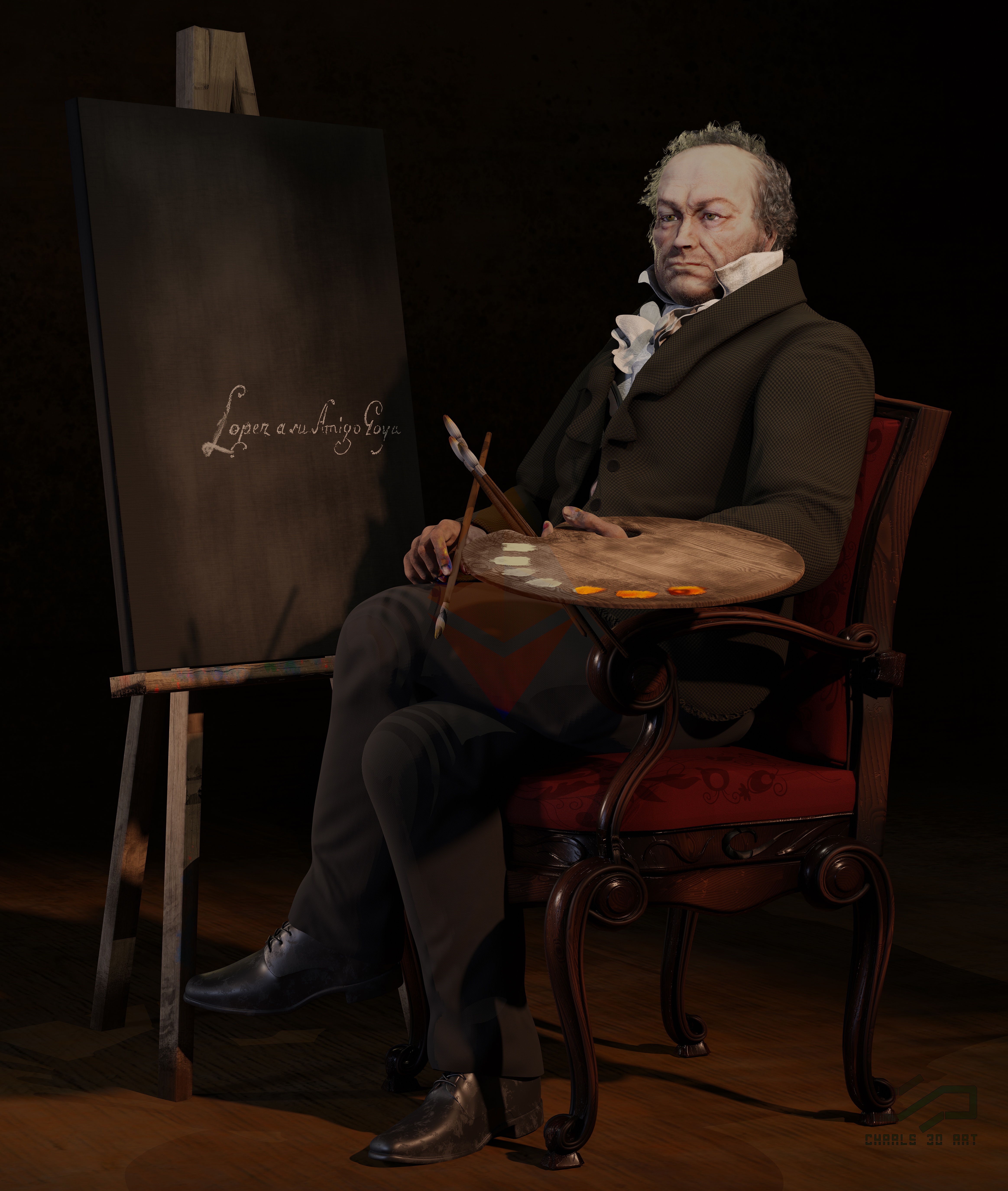 Hola amigos, Por fin terminado mi proyecto, tributo a Goya, espero que os guste, he puesto un render de baja calidad y un par de capturas de pantalla con el proceso de render que estoy haciendo y señalando las horas que lleva y lo que le falta pro terminar.