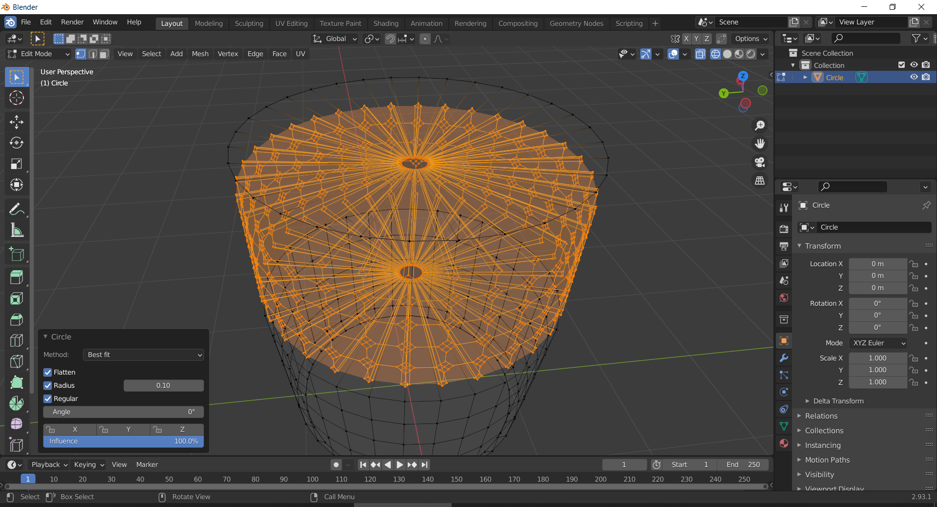 Sin embargo, he encontrado este tutorial que se asemeja bastante a lo que quiero, pero al aplicar la herramienta LOOP TOOL > CIRCLES (minuto 2.49 del vídeo), a mí me pasa que trata de hacer un círculo con todos los puntos seleccionados, en vez de hacer un agujero por cada grupo de puntos seleccionados.
