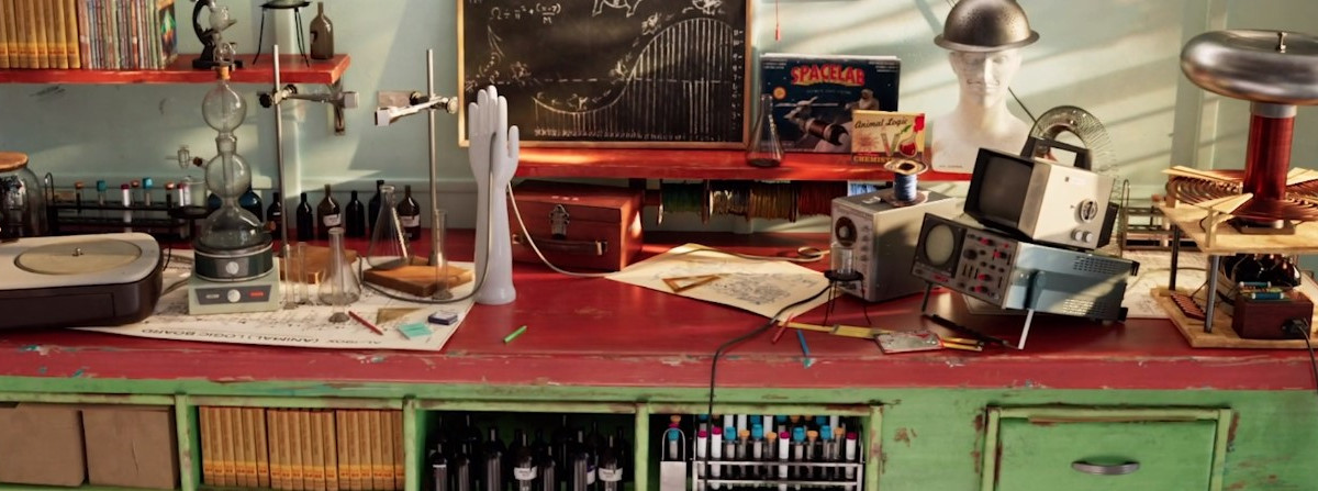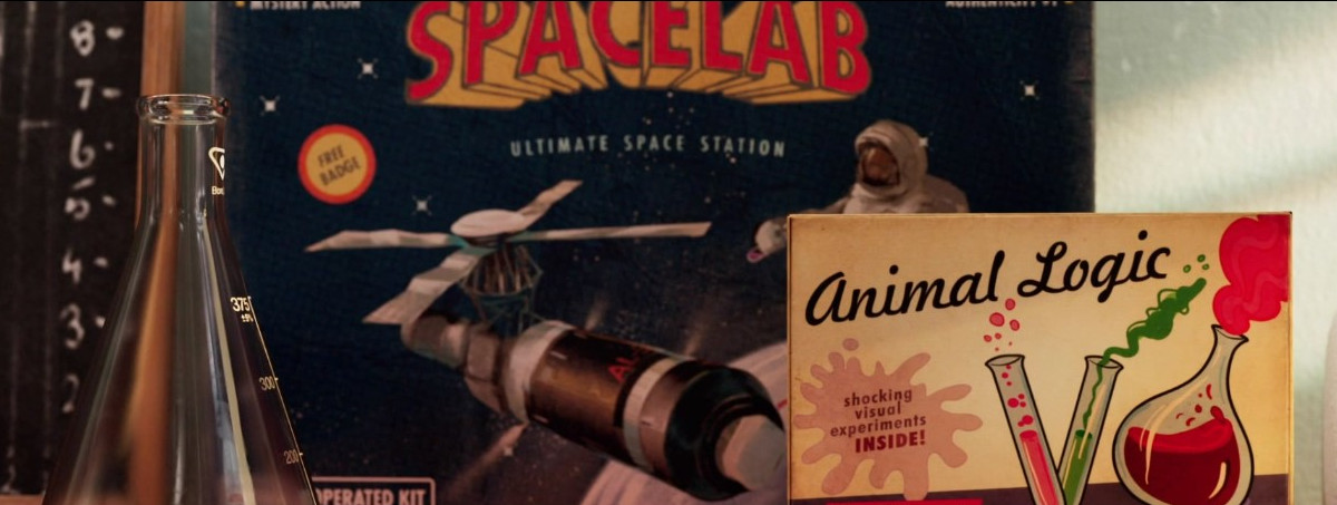 Un kit de química, bola de plasma, líquido ferroso, monos marinos, pájaros bebedores, una granja de hormigas. No queda nada. Ahora es su reino y patio de recreo, su propio laboratorio creativo. La escena está inspirada en el primer conjunto de química de Animal Logic, y se sustenta en una estética única y familiar para cualquiera que haya visto los estudios de Animal Logic.