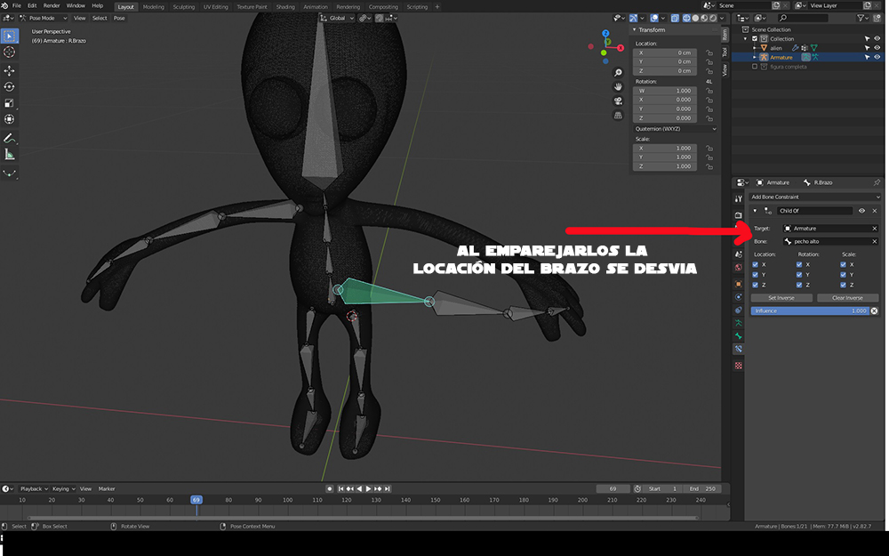 Además cuando estoy emparentando el hueso del brazo con el de la columna en la zona alta con CLID OF, este se pone en rojo y el emparejado tengo que invertirlo por que no se coloca en su sitio. No sé, es la primera vez que hago rigging de una personaje. Aun así en modo pose se mueven correctamente los huesos pero como digo al unir la malla con la armadura me da error.