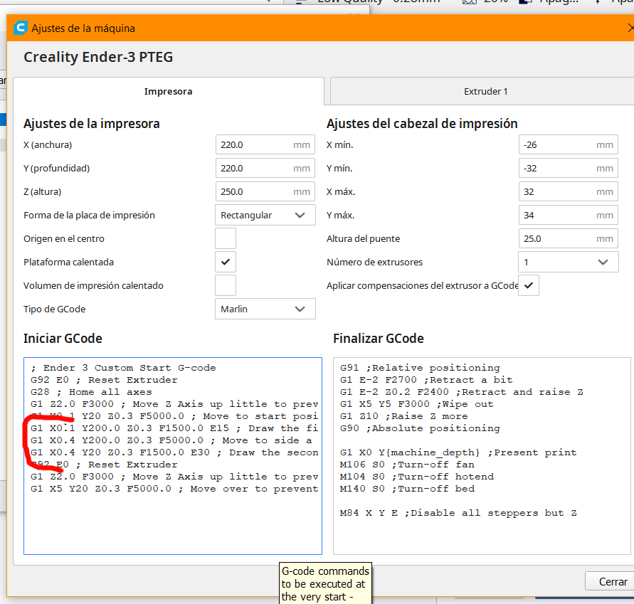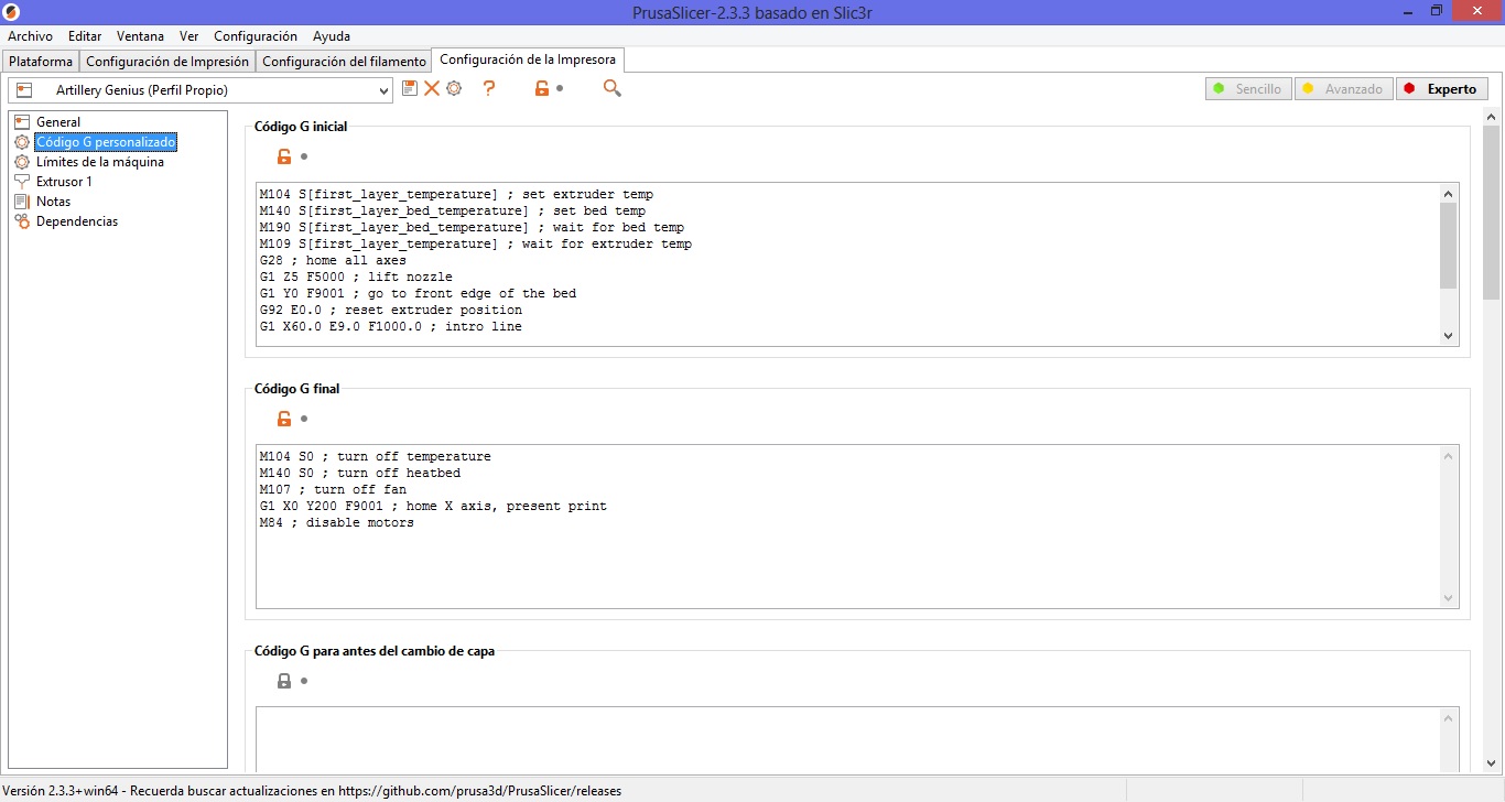Gracias estimado por su ayuda y atención. El laminador que ocupo es el PrusaSlicer. Yo también creo que puede ser el Gcode, adjunto en la fotografía uno, mi configuración inicial y final del Gcode.