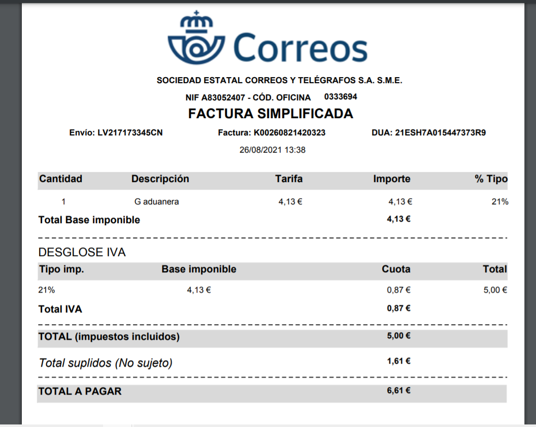 Al llegar el cartero, me dice que me tiene que cobrar esos impuestos y el resultado es esta factura.