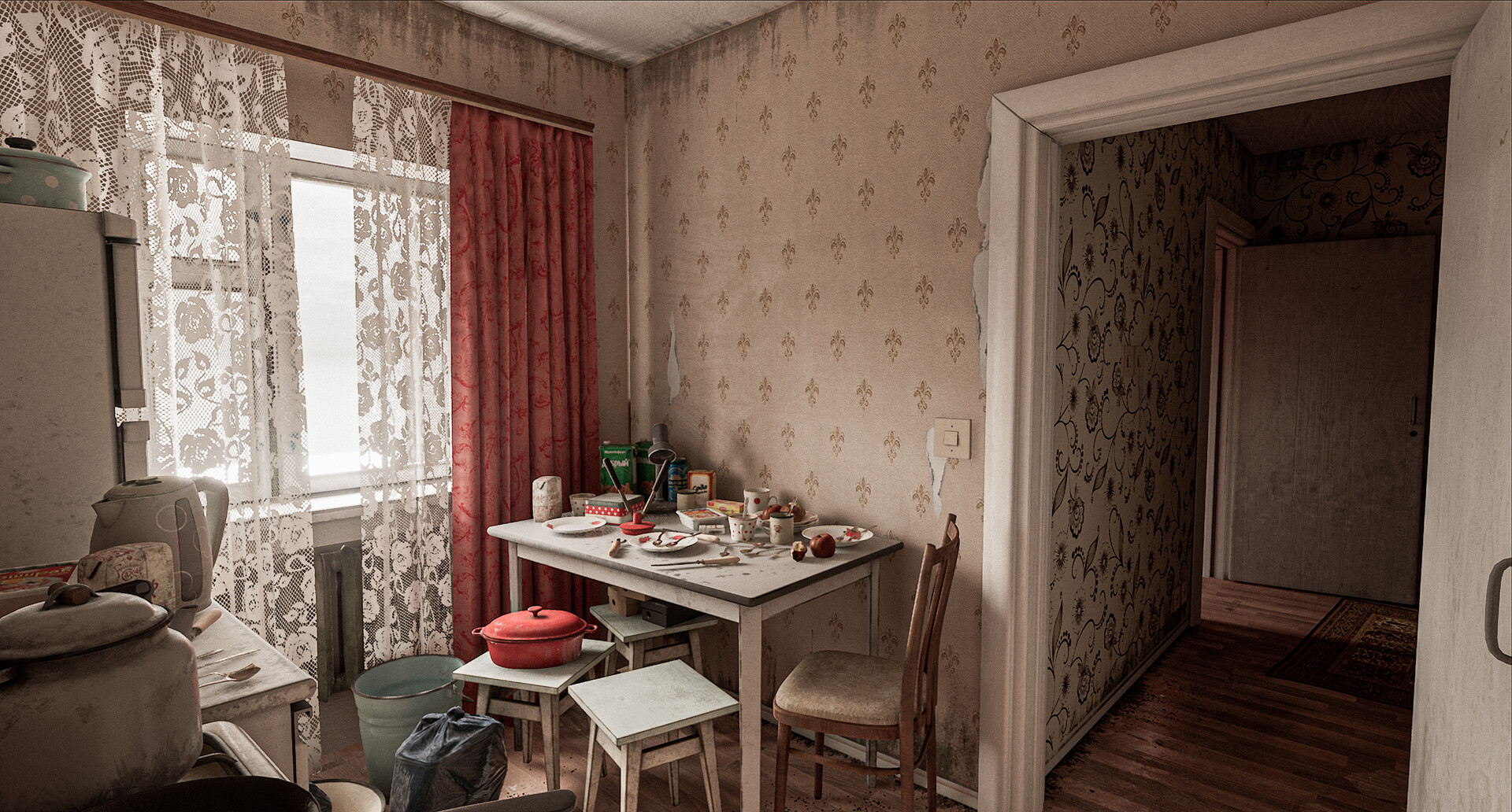 Traté de llenar el entorno con detalles y desorden general del entorno tanto como fuera posible. Las cosas más obvias en los lugares más insospechados. Según la idea, una persona común vive en el apartamento, eventualmente pierde la cabeza y cae en depresión debido a la rutina de su vida.
