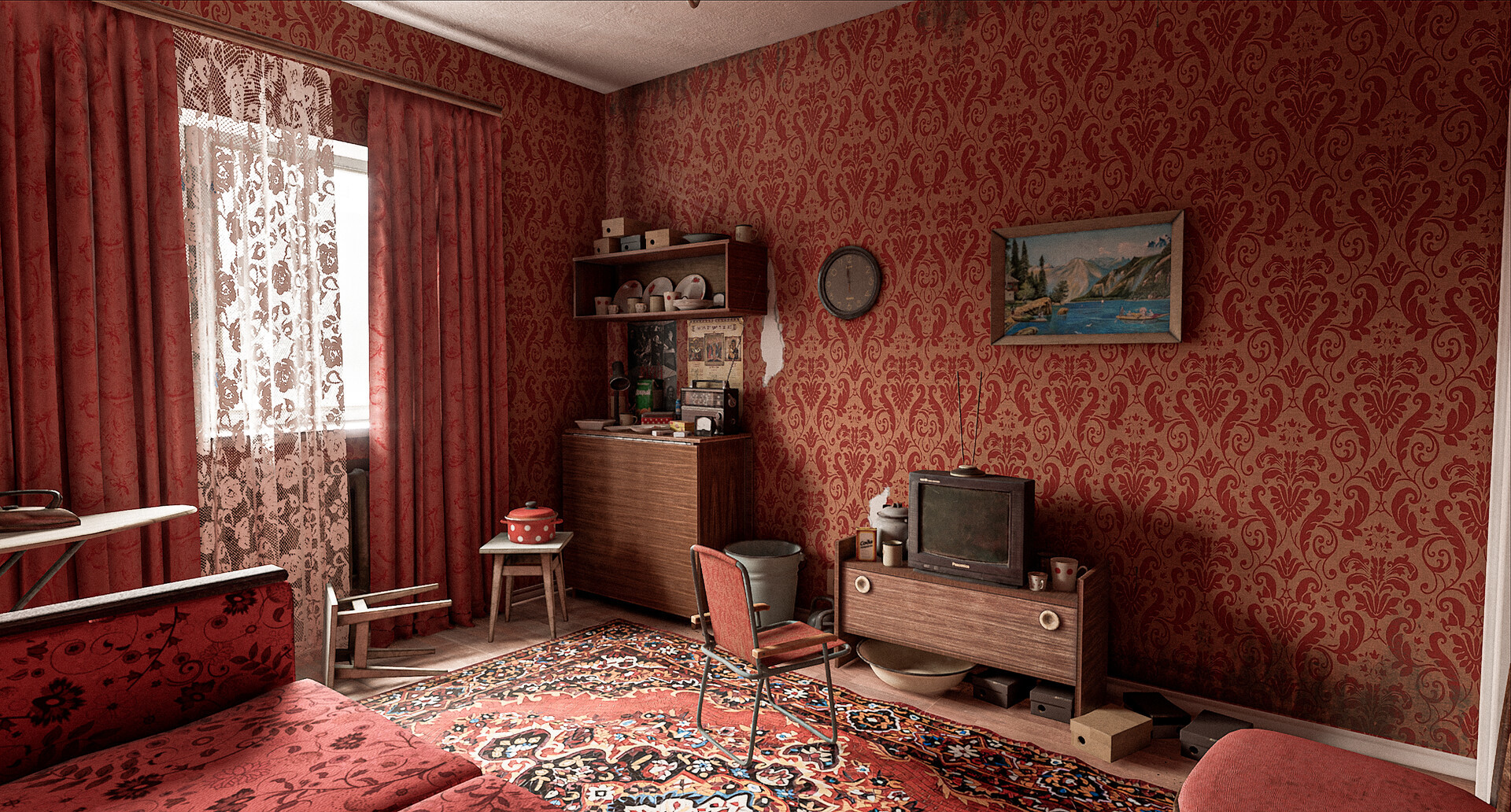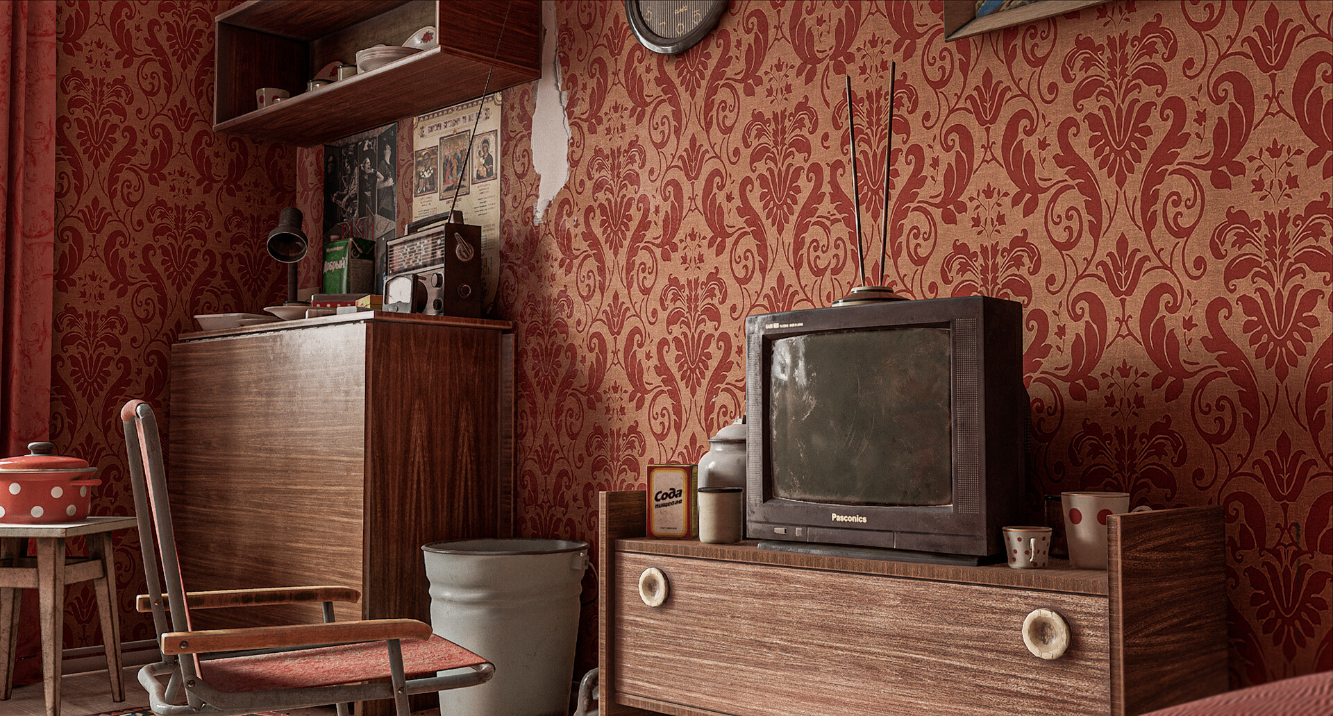 Todos los activos en esta escena son hechos por mí personalmente, excepto el viejo televisor. Gracias a Vitaly Ivanov por proporcionarme el modelo.
