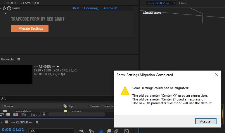 Hola buenas noches a tod@s, conozco un poco (no mucho) After Effects, he hecho algún video con él. El problema viene porque con un video que estoy haciendo necesito usar Trapcode Form, bien pues lo tengo instalado y me he asegurado de migrar los archivos del video que usan dichos efectos pero aún así me sigue saliendo el fallo que os pongo más abajo y la verdad es que ya sé qué hacer.