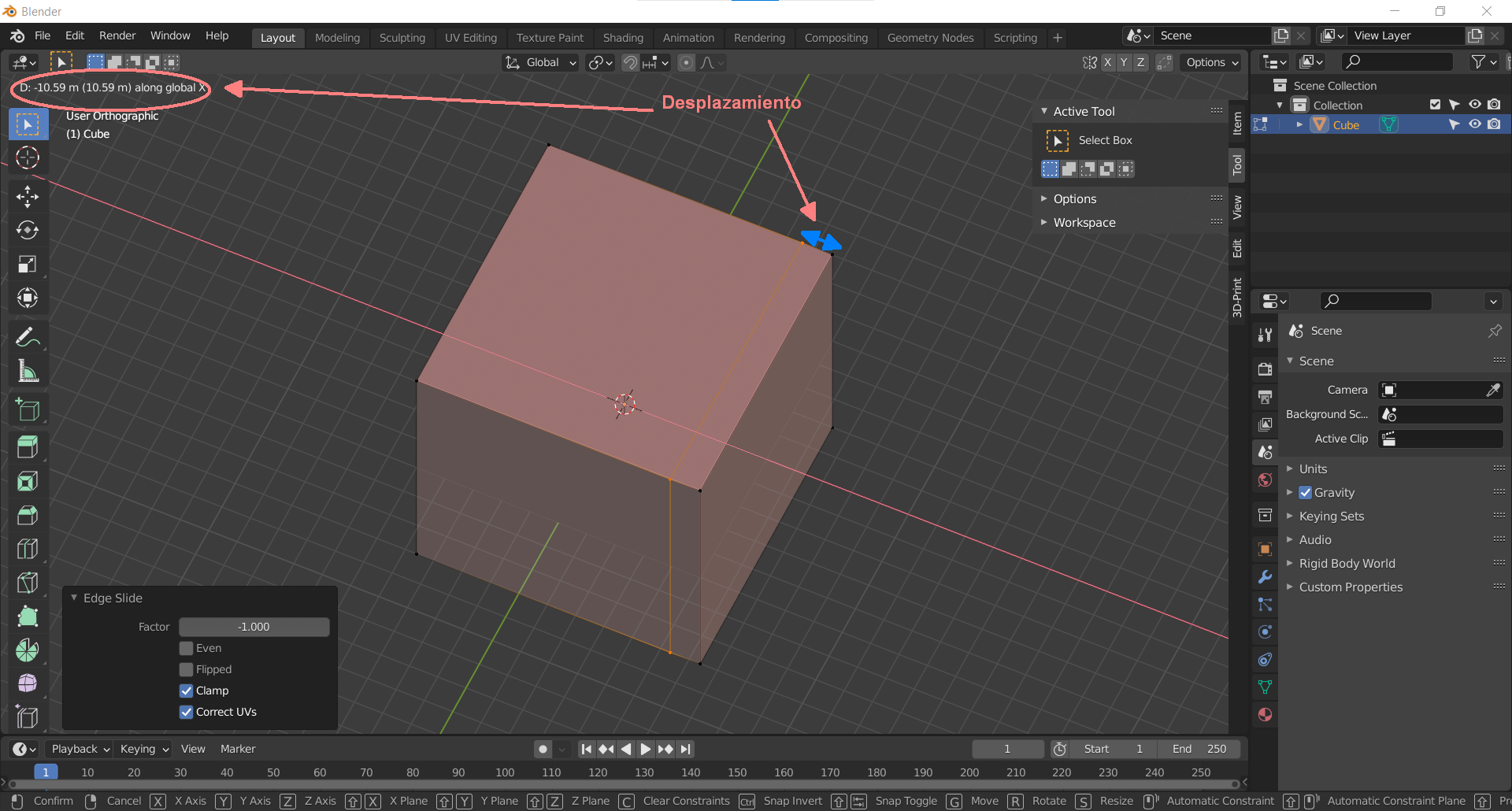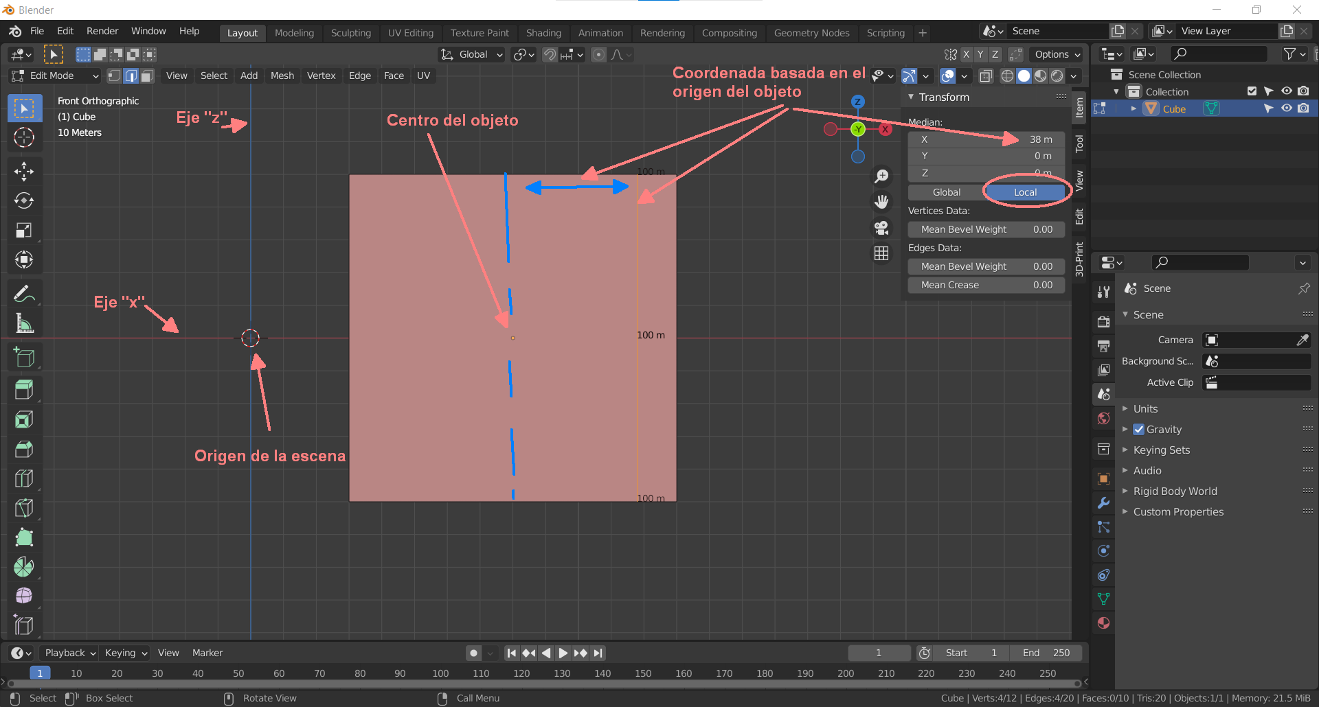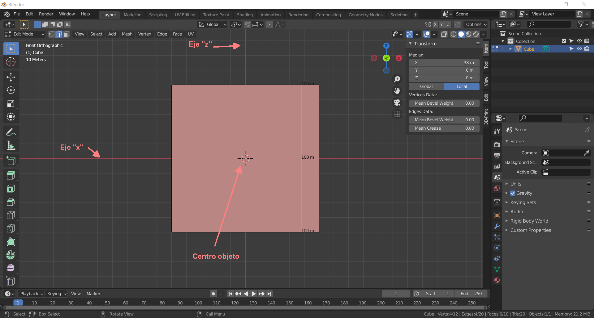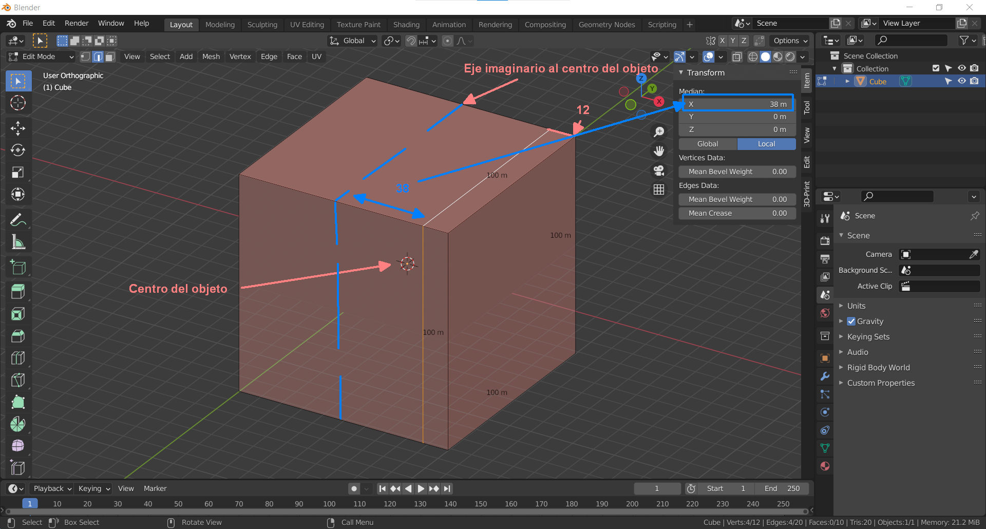 Quiero hacer el Loop a 12 milímetros de una arista superior. Pulso CTRL+ R, selecciono la dirección del Loop, me acerco a la arista de la que quiero separarme 12 milímetros pulso G+X y tecleo 12. En lugar de tomar la arista en la que me posicione el Loop me lo realiza a 12 milímetros de una arista imaginaria que hubiera en el centro, así que me lo hace a 62 milímetros de la arista que quiero.