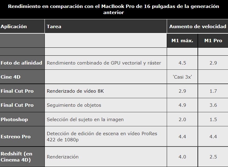 A diferencia del anuncio del M1 Max, Apple no ha proporcionado comparaciones detalladas de rendimiento con los sistemas de la generación anterior para aplicaciones creativas específicas.