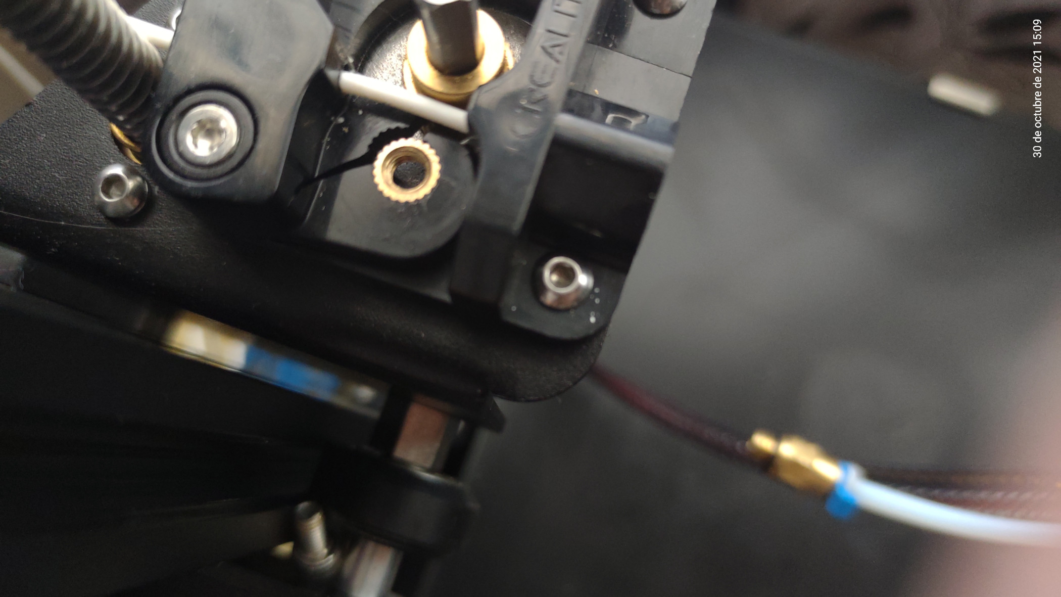 Estoy usando PLA y pongo la boquilla a 210. De todas formas probé sin que pase por el tubo, simplemente viendo yo cuando imprime.