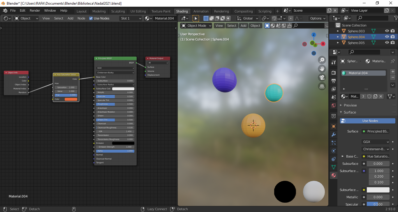 El caso es que quiero tener bolas de diferentes colores globales y que el dibujo tenga el mismo. Para ello al color global le he añadido un Shader Hue/Saturation y delante de él un Object Info.