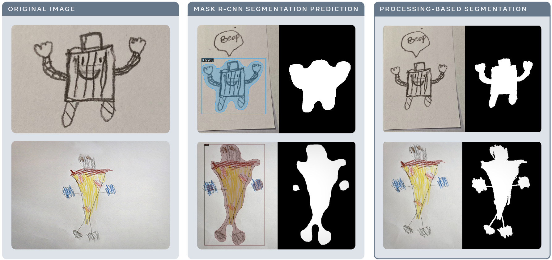 Al extraer los personajes humanos dentro del dibujo de un niño para su procesado, utilizamos el modelo de detección de objetos basado en la red neuronal convolucional de Meta AI, Mask R-CNN, como se implementó en Detectron 2. Mask R-CNN está entrenado en uno de los conjuntos de datos de segmentación más grandes disponibles públicamente, pero se compone de fotografías de objetos del mundo real, no de dibujos. Para trabajar en dibujos, el modelo necesitaba ser ajustado, lo que hicimos con ResNet-50 + FPN para predecir una sola clase, "figura humana".