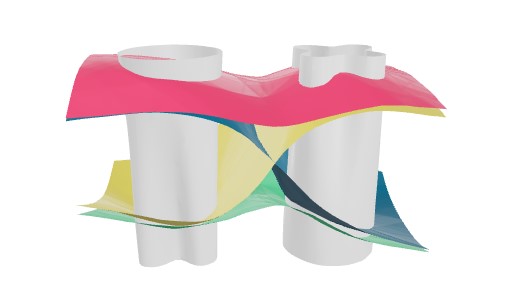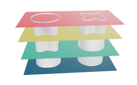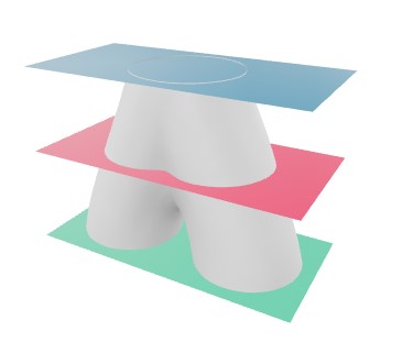 HyperNeRF representa los cambios en la topología de escena al proporcionar un NeRF con una entrada de mayor dimensión. Esto está inspirado en métodos establecidos en niveles. Los métodos de conjunto de niveles proporcionan un medio para modelar una familia de formas topológicamente variables como rebanadas de una función auxiliar de dimensión superior. Por ejemplo, estas formas: