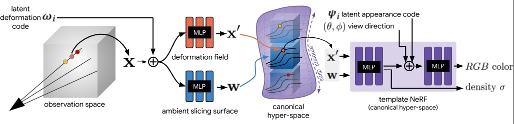 Abordamos esta limitación elevando los NeRF a un espacio dimensional superior y representando el campo de radiancia 5D correspondiente a cada imagen de entrada individual como una rebanada a través de este "hiperespacio".