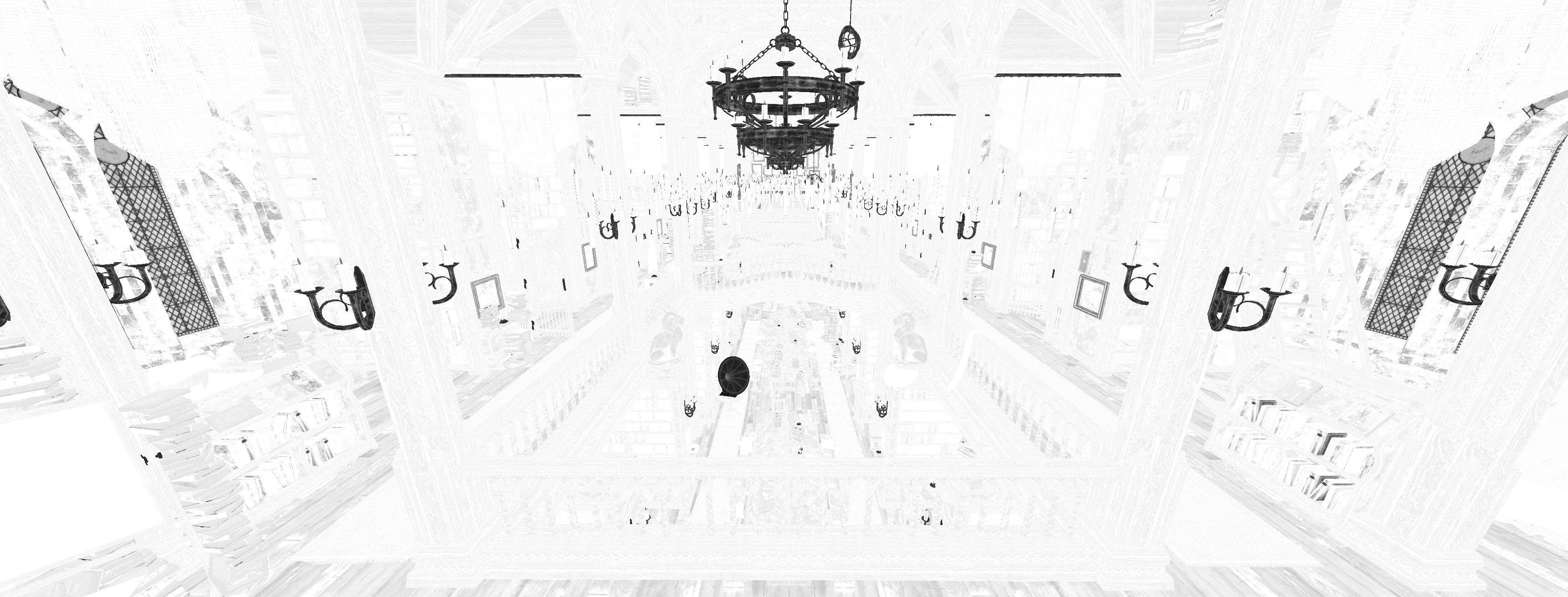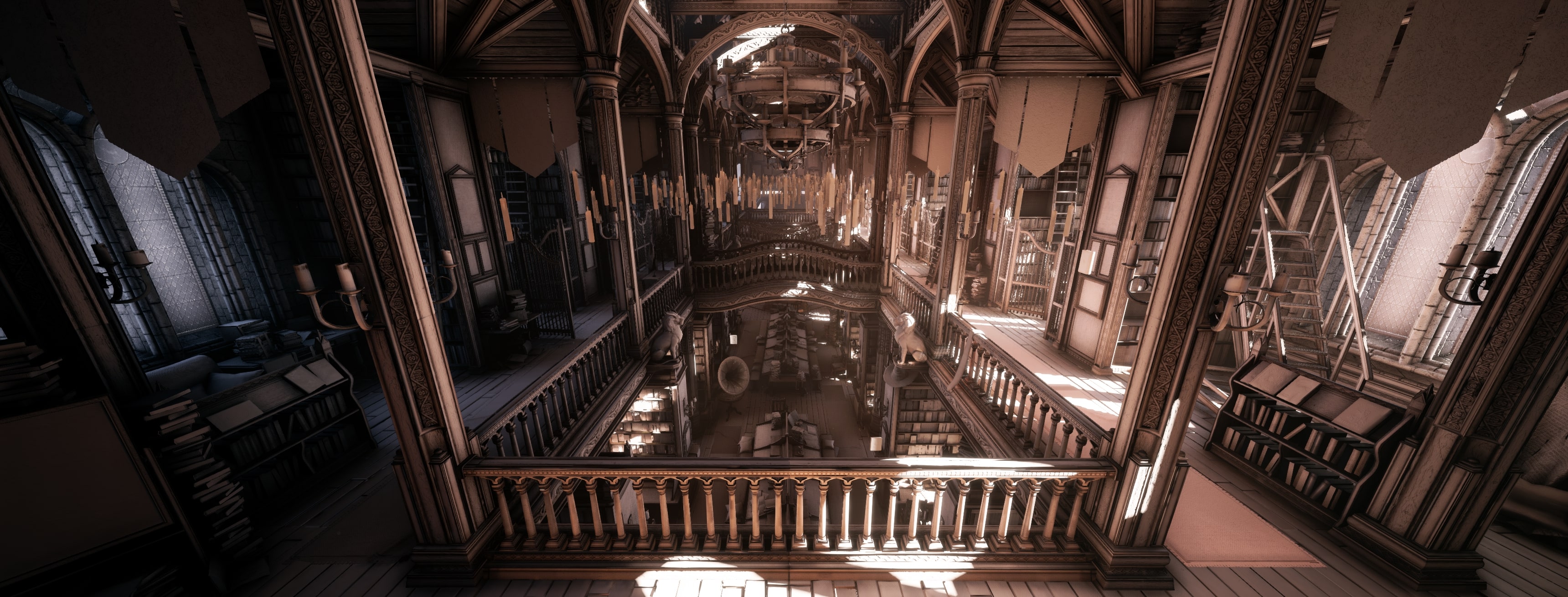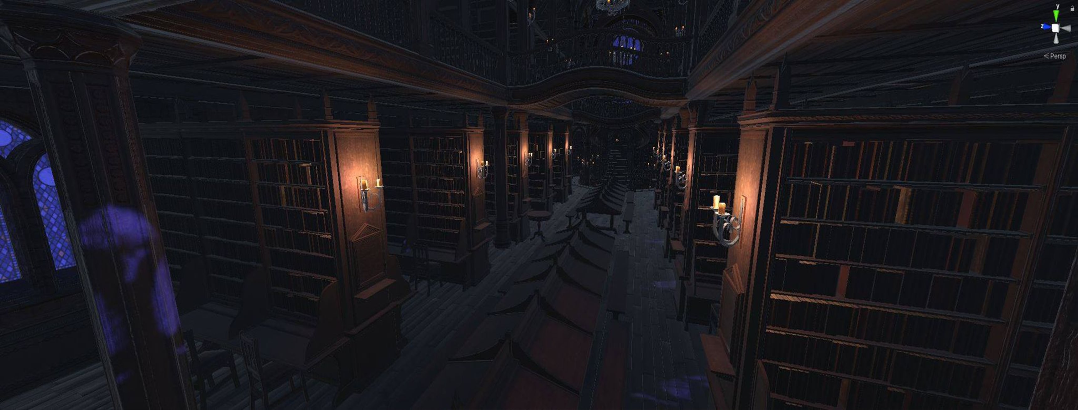 La escena está completamente bakeada para tratar de lograr el mayor ambiente y calidad posible; por lo que básicamente usamos luz direccional para simular el sol y claraboya para traer un color más natural en la habitación desde el lado del edificio donde no toca el sol. También he utilizado algo de niebla volumétrica para dar más textura a la global a la Biblioteca.