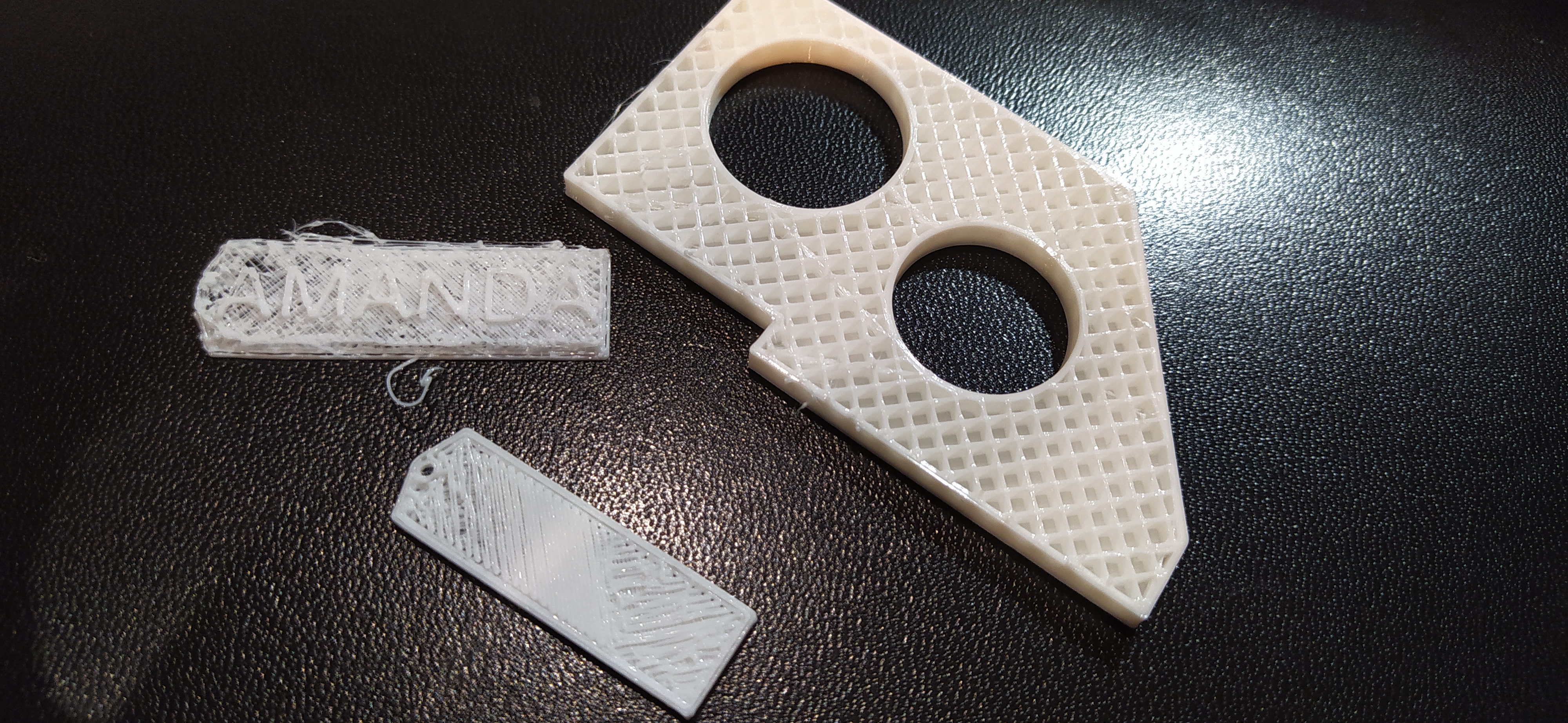 En la fotografía podéis ver una pieza perfecta de hace 3 días (perfecta hasta que llegó a la capa que empezó a desmadrarse), y las siguientes son impresiones sucesivas. Una es una plaquita con el nombre "AMANDA" que, aunque las capas inferiores están con el defecto, las letras se ven más o menos bien, por lo que no creo que sea un tema de correas, la otra es la misma placa que no llego ni a la última capa.
