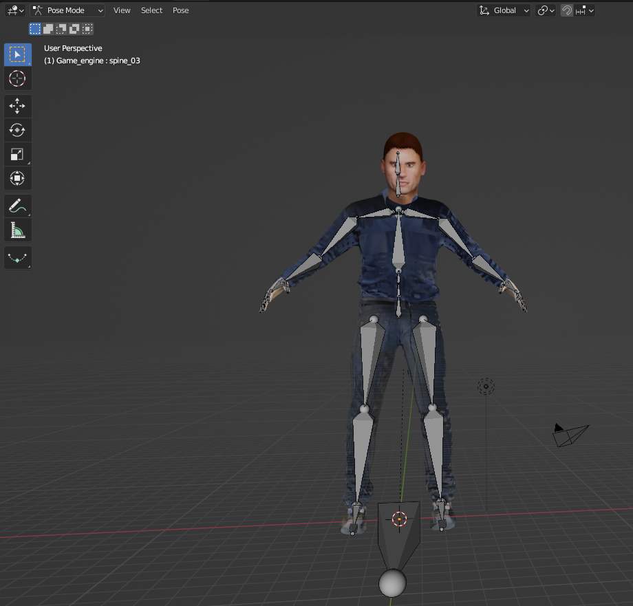 Ahora mismo estoy en conflicto porque toda la estructura de mi personaje con el esqueleto, cuando en modo objeto, y reset position, uniendolos con Parent/ Armature Deform with automatic weights para supuestamente unir todos los elementos, y cuando paso a pose position el esqueleto queda en el eje del modo Pose position pero la estructura del cuerpo del personaje sigue en el eje de Reset Position.