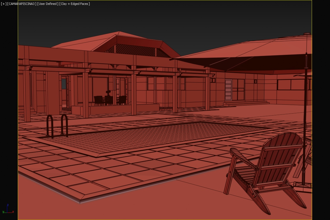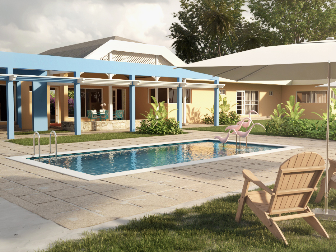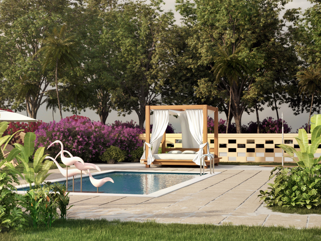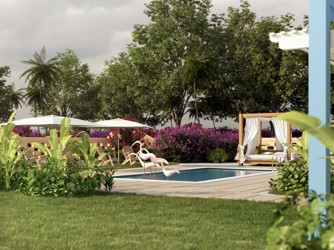 Les presento una pequeña escena de un patio con piscina.