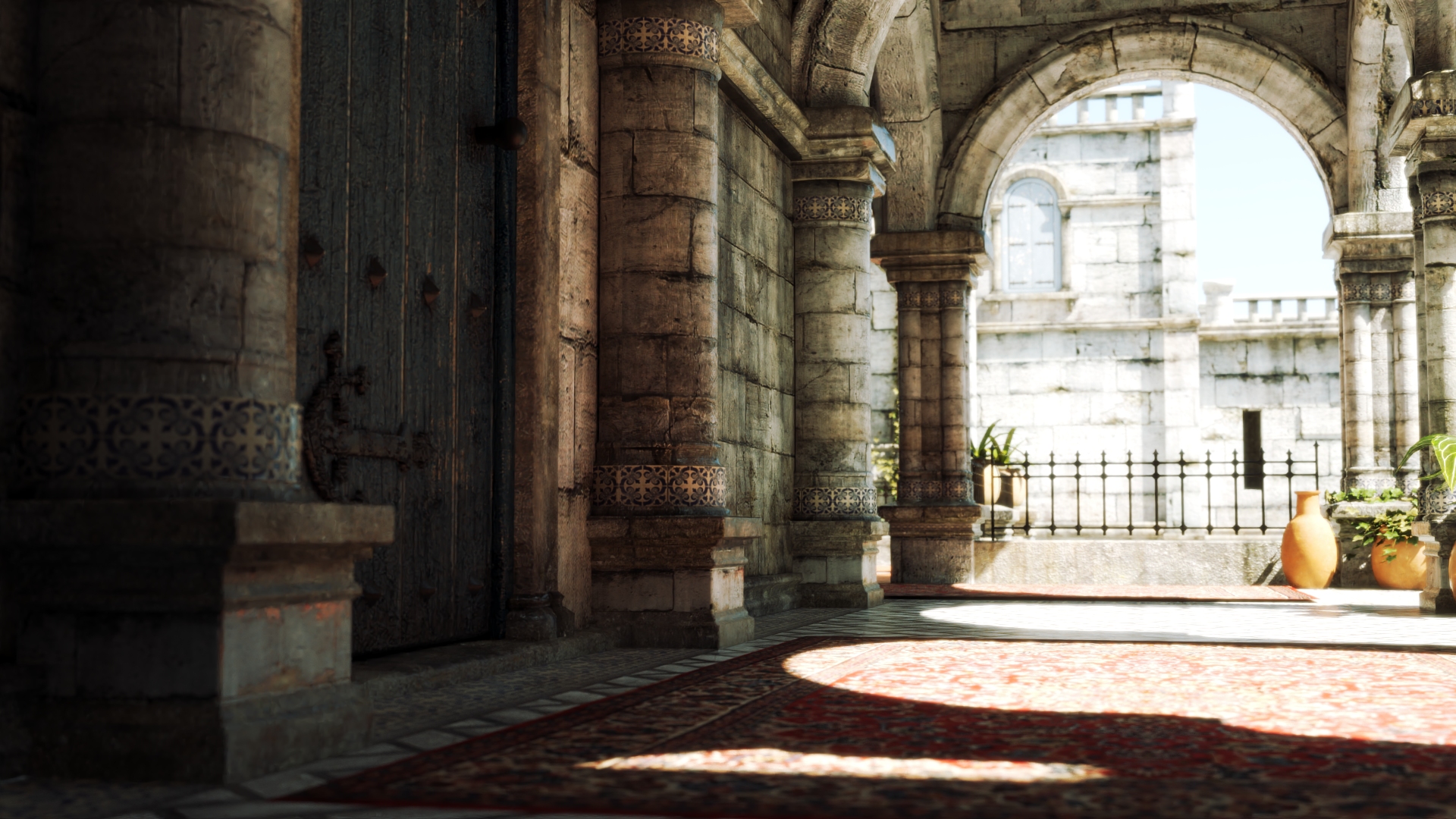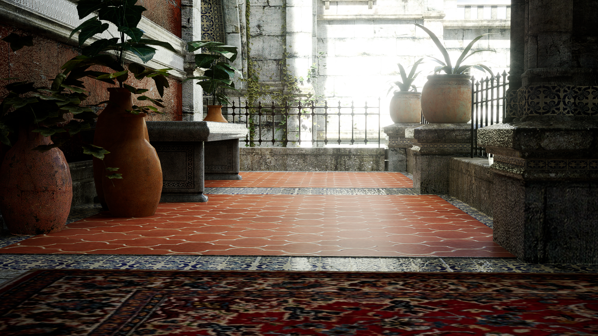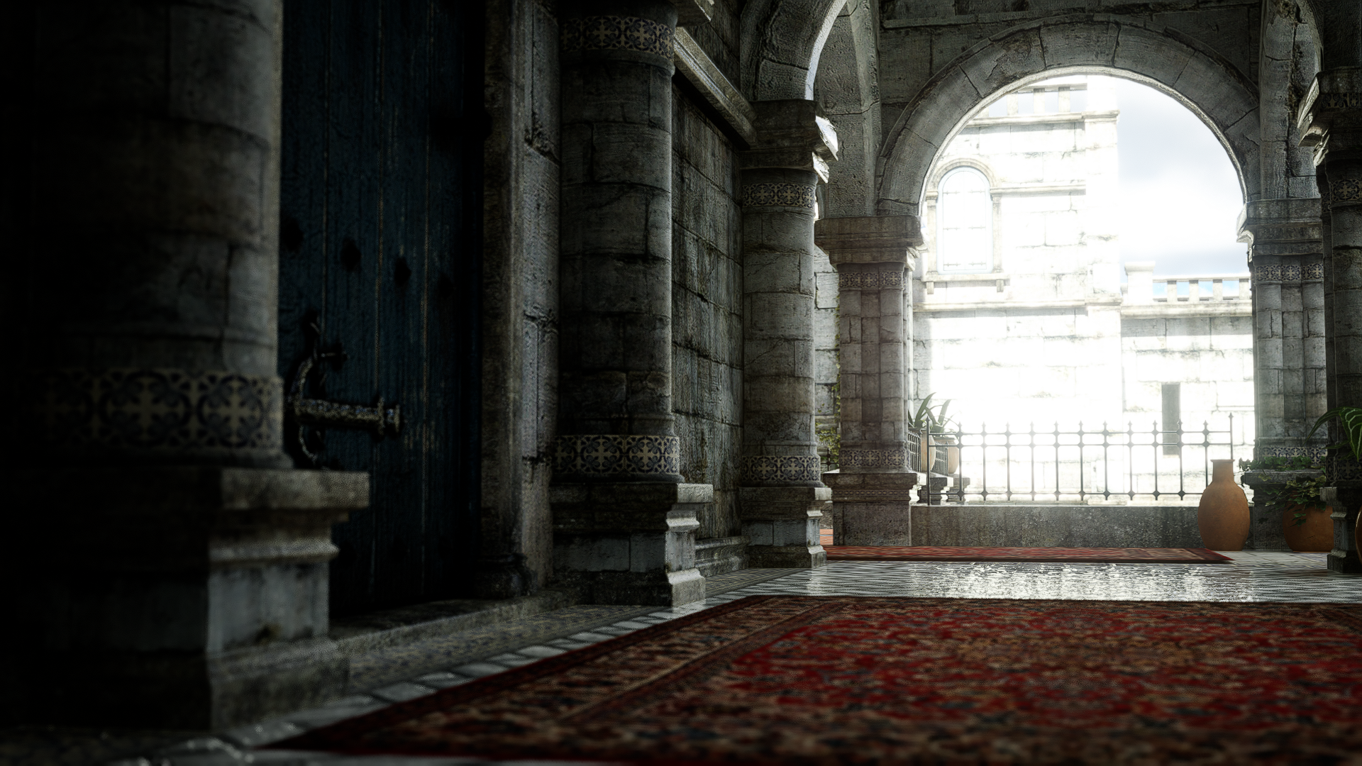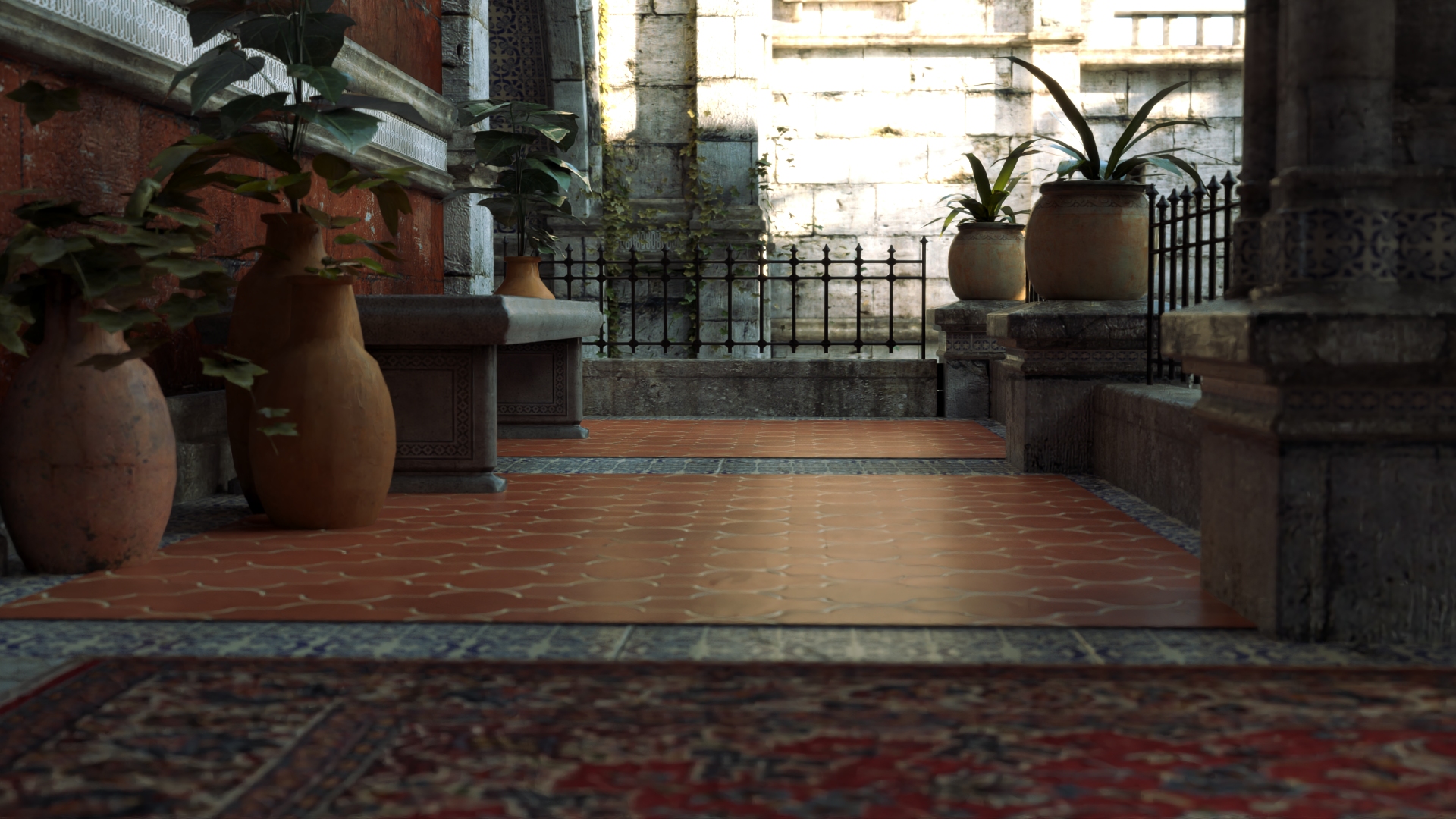 Especialmente en el tercer par de imágenes puede verse como d5 arroja una GI muy generalizada, casi indiscriminada, viéndose dentro de la galería casi tan luminoso como afuera, perdiéndose las sombras de contacto, y la alfombra no arroja su color sobre los muros, falla el color bleeding.