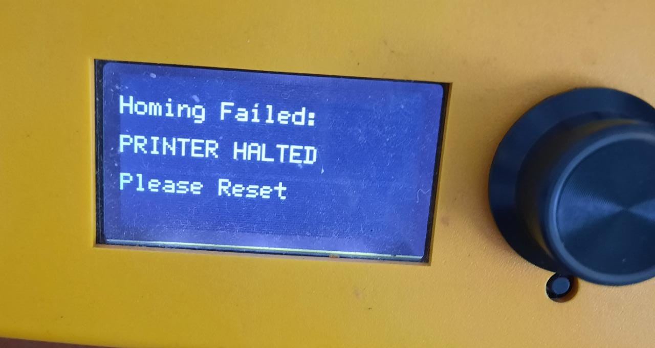 Primero la cama de impresión comenzó a moverse más allá de sus límites, el LED encendía pero no detectaba el limite. En ese momento sucedió el error "Homing failed PRINTER HALTED Please reset".