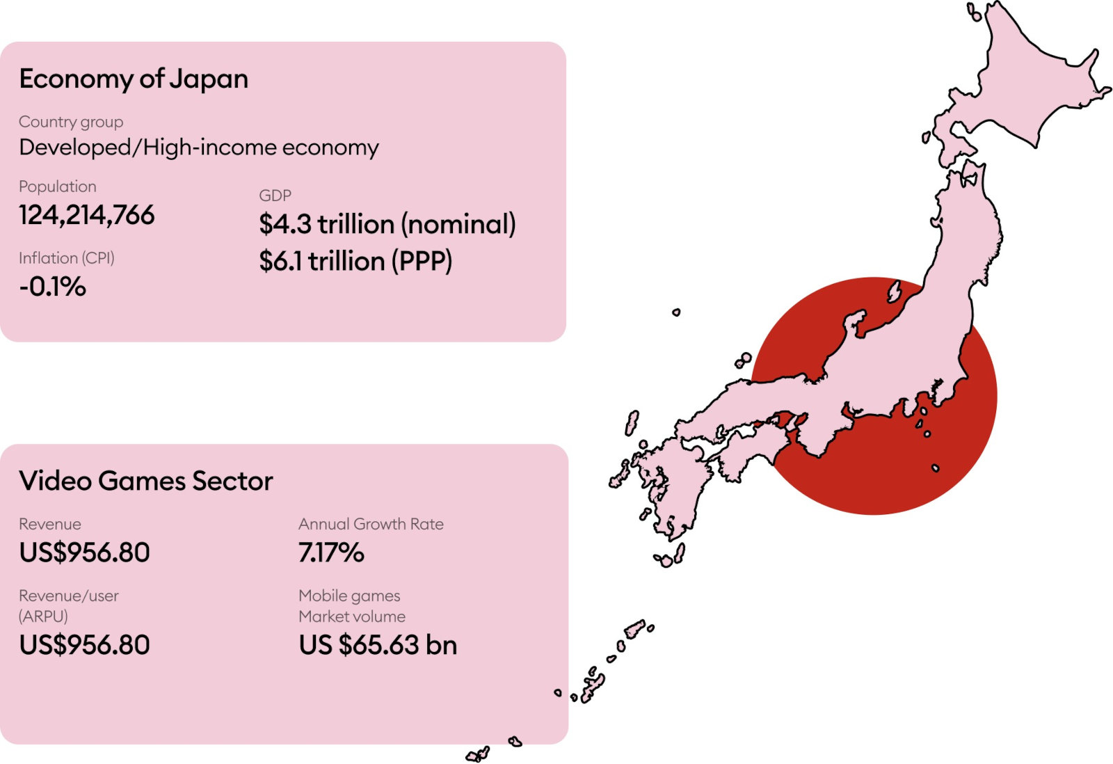 La economía de Japón es una de las más poderosas del mundo y su población asciende a 126 millones de personas, con altos niveles de igualdad de ingresos y bajas tasas de desempleo. El mercado de juegos de Japón es increíblemente fuerte y se proyecta que los ingresos en el segmento de videojuegos alcancen los $72 mil millones de dólares en 2023.