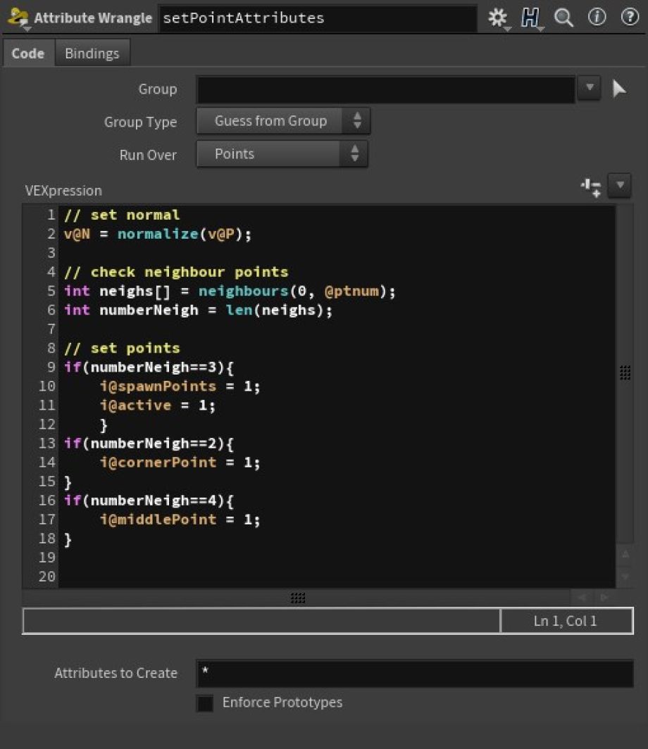 La siguiente fase consiste en establecer algunos atributos de puntos que serán utilizados en todo el sistema. En primer lugar, se asigna un atributo propio al punto medio, seguido de las esquinas y, posteriormente, los puntos restantes se emplearán como puntos de generación para las nuevas plataformas. De esta manera, se crean tres atributos diferentes en esta cuadrícula. Además, se configuran las normales de cada punto para que apunten hacia afuera.