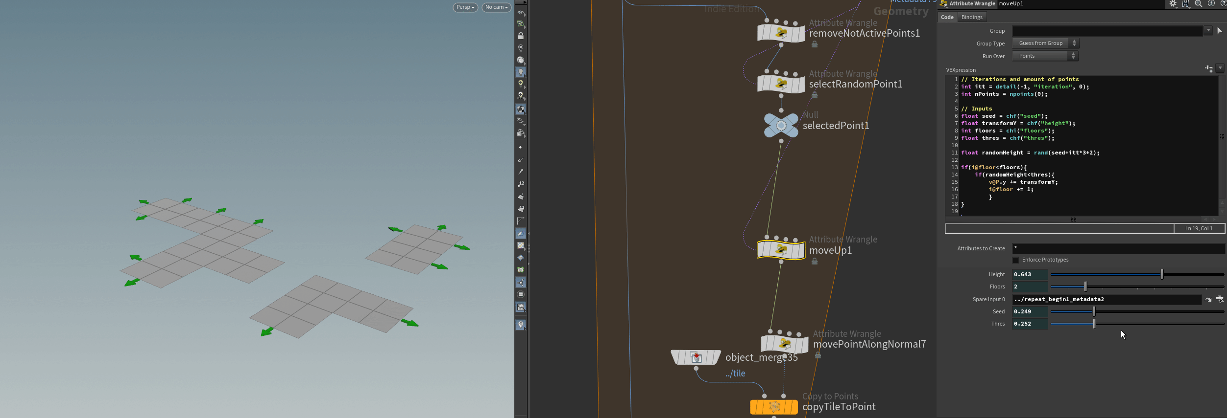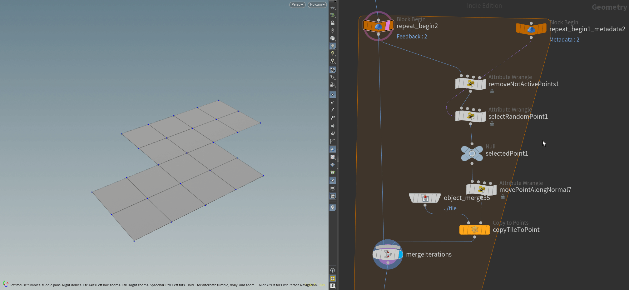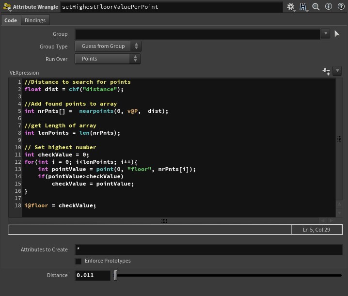 Comenzaré fusionando los puntos con un objeto, eliminando todo excepto los puntos con el atributo de esquina y aplanando todos los puntos al suelo. Esto creará varios puntos superpuestos, que pueden tener diferentes valores de atributo de suelo, por lo que debo establecer el valor más grande del atributo de suelo para todos los puntos superpuestos. Para ello, utilizaré una función de comparación de puntos llamada "nearpoints", que agregará todos los puntos superpuestos a una matriz y luego recorrerá esa matriz para establecer el valor más grande en todos los puntos de esa matriz.