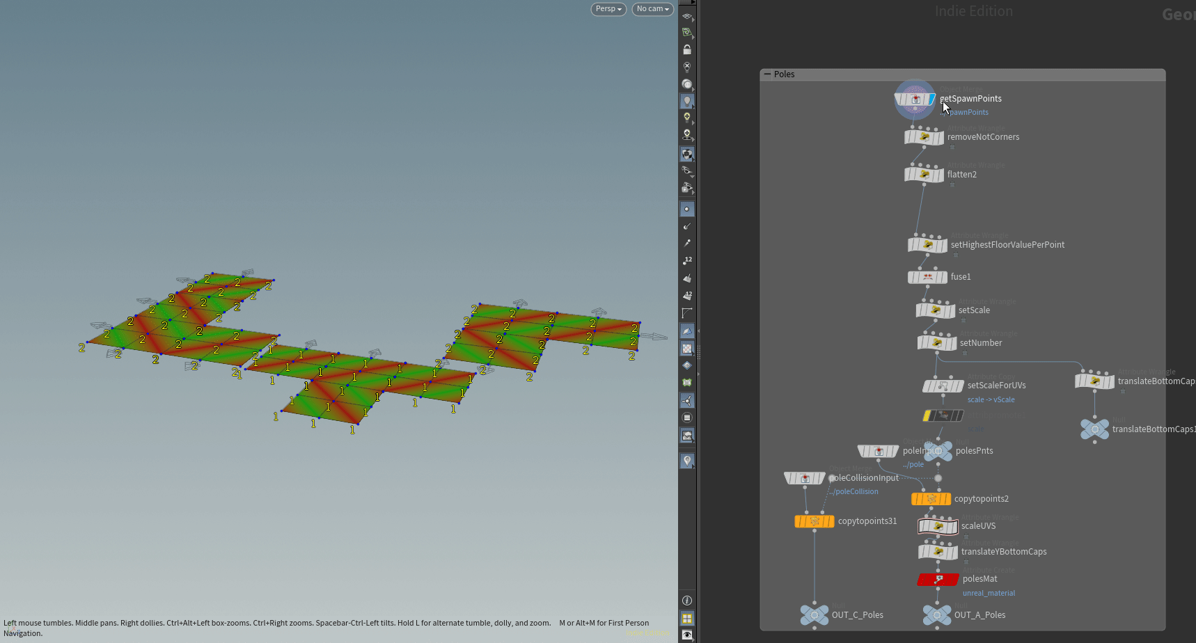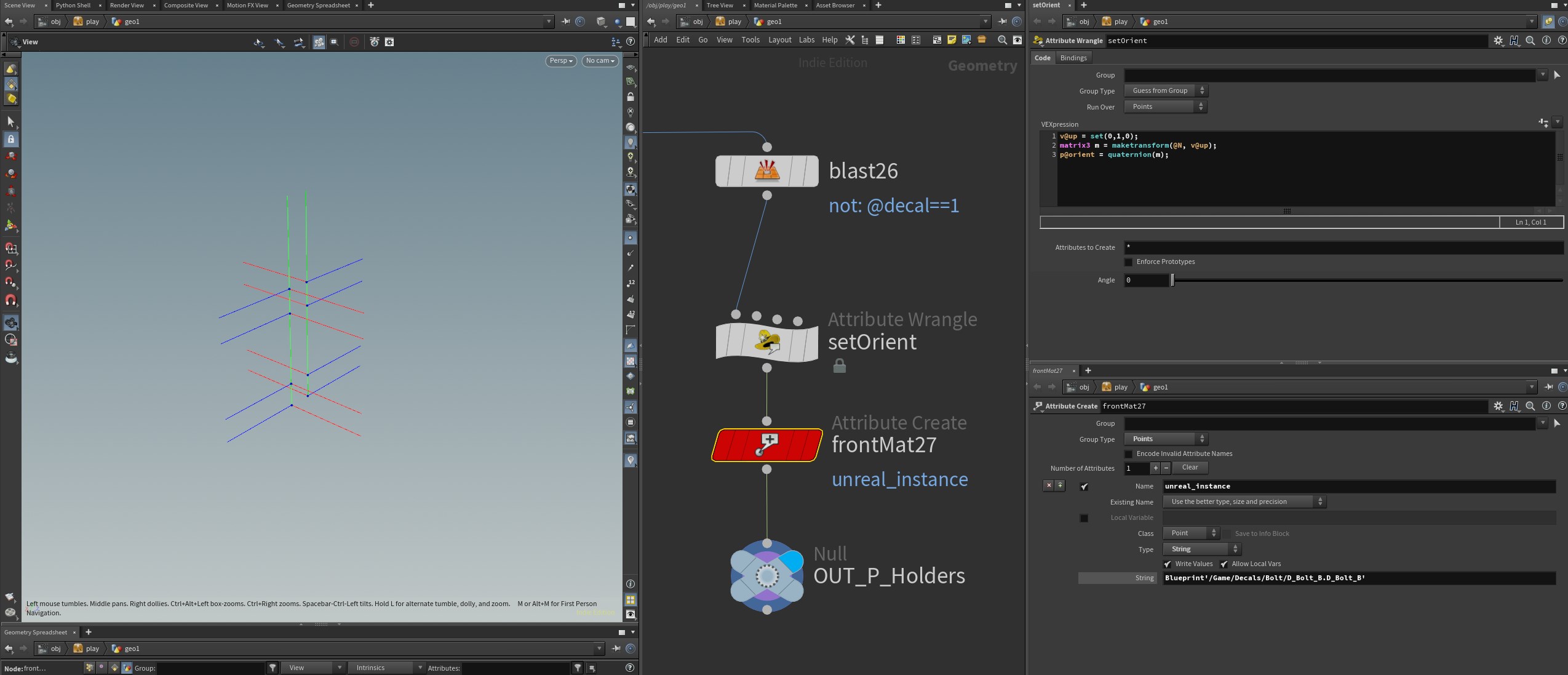 Una de las últimas partes que he añadido ha sido la opción de generar calcomanías. Para ello, comienzo creando algunos puntos y luego configuro su atributo de orientación para que se ajuste correctamente en Unreal Engine. Además, establezco un atributo de cadena llamado "unreal_instance" que hace referencia a la calcomanía que se desea utilizar. En este caso, utilizo un plano. Para algunos lugares, como las paredes, también establezco la escala de las calcomanías para que se ajusten al ancho o alto de la pared si se modifica su tamaño.